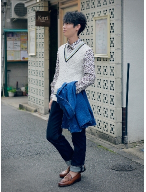 柄こそ伝統のクラブチェックを用いた英国感漂うシャツですが、背面のギャザーや直線的な裾カットなどはどこかフレンチシャツを思わせる出で立ち。個人的にそのままのテイストで着るには少し「かわいすぎる」感じがしたので、ロールアップしたデニムとローカットブーツを合わせて漢臭さを味付けしました。