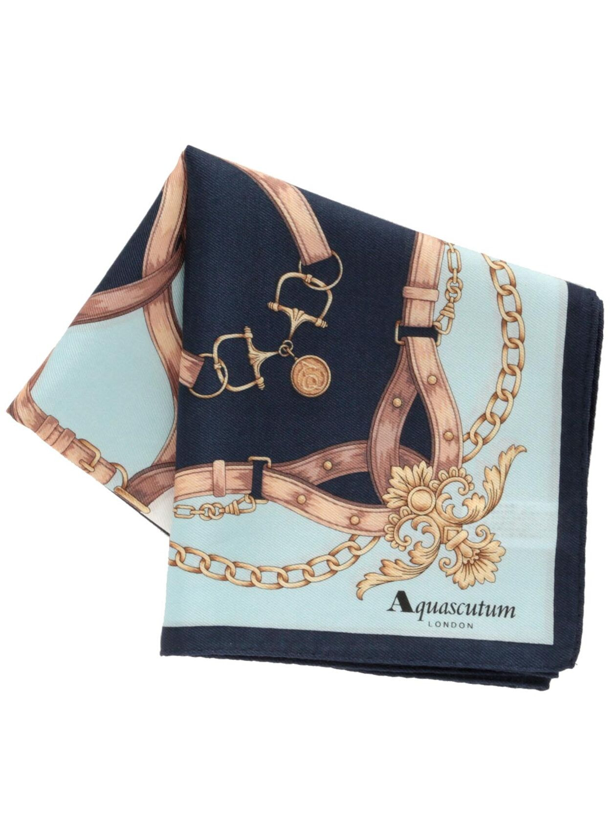人気のベルト柄にメタルモチーフを組み合わせ、高級感のある一枚に仕上げました。綿シルクの大判サイズのハンカチです。スカーフの代わりに首に巻いても洗濯ができるので、清潔にご使用になれます。