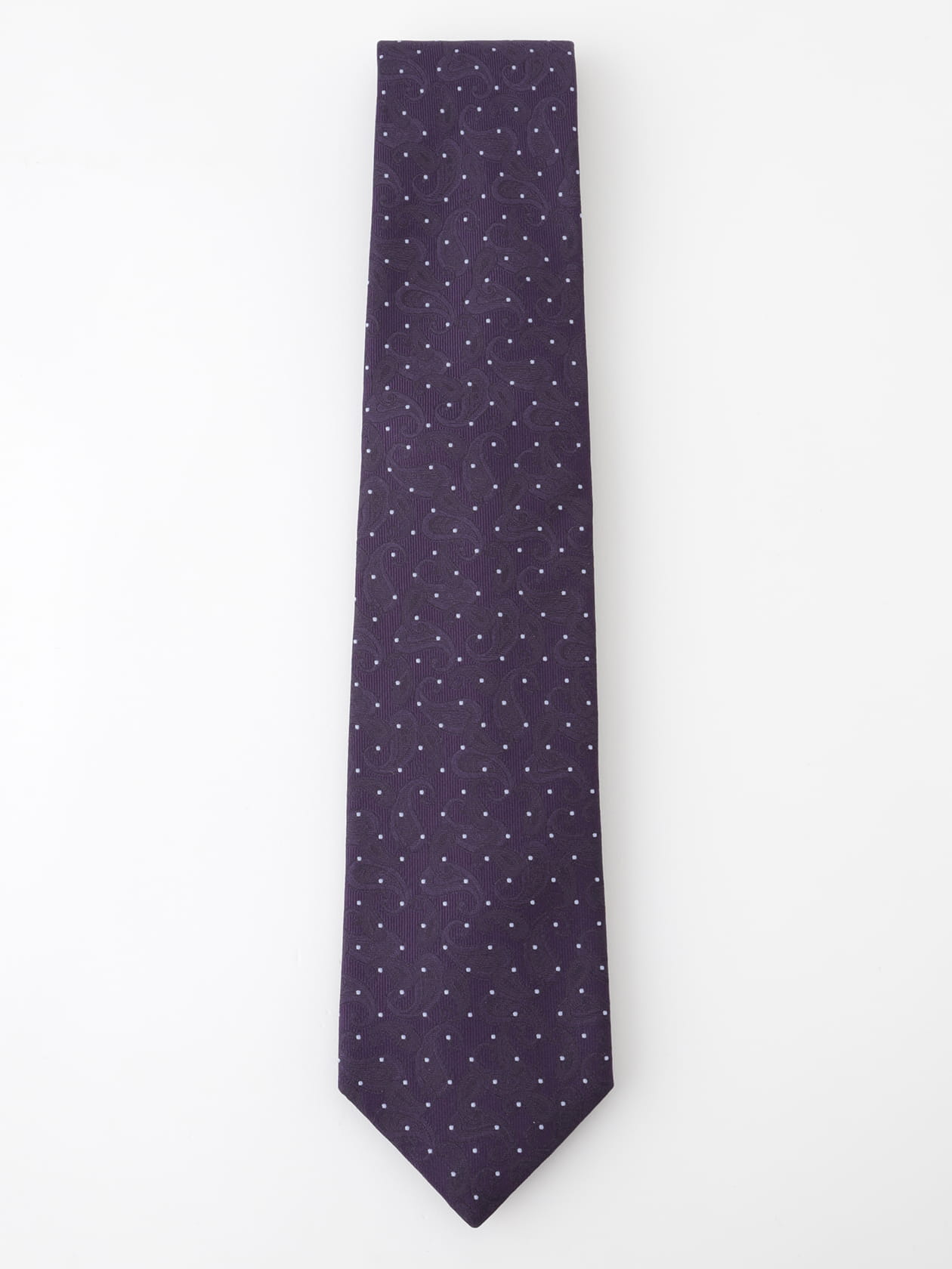 ペイズリードット×小剣クレスト柄のネクタイ。 ペイズリー柄とドット柄が組み合わされた斬新なデザインに、小剣部分にクレスト(紋章)をあしらったネクタイです。このデザインは、伝統的でエレガントなペイズリー柄と、カジュアルなドット柄を組み合わせることで、クラシックさと遊び心をバランス良く融合させています。さらに、小剣部分のクレストデザインがアクセントとなり、個性を引き立てます。