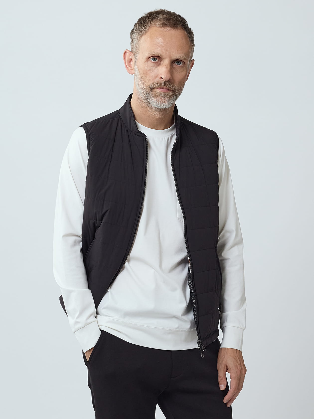 現代人の為のコンフォートライン「TEC.3」シリーズの中でも、「旅」をテーマとしたディテールを盛り込んだ新ライン「TEC.3 Trip」から、ナイロン素材のウエストコートが登場です。 持ち運ぶことを前提に、軽さとシワになりにくさにこだわったこのラインは、ナイロン極細糸の15デニールの糸にポリウレタン糸を巻いた、高密度かつ伸縮力に長けた素材が魅力です。 旅先のどんなシーンにもはまるよう、配色はフォーマルウェアから着想を得たマットブラックを採用。いわゆるシャカシャカ系の洋服とは一線を画す上質な見た目と着心地がうれしいし一枚です。 ウエストコートは襟にボマー襟を採用し、内側にもマルチポケットを配した、インナーのみならず単品遣いでも通用する仕上がりとなりました。 モデル H:185㎝ 着用サイズ:38