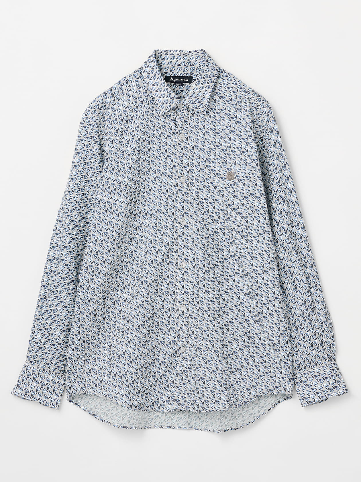 海辺のテトラポッドをイメージした爽やかな総柄シャツです。 一定のパターンで敷き詰められた幾何学的なモチーフと、空をイメージした爽やかなブルーが印象的な一枚。襟にまでしっかりと柄が配置されているので、無地セーターのインナーとしても映える仕様。 上質なコットンにレーヨンを含ませることでサラリとした肌触りと、上品なドレープ感を表現した、病みつきになる生地感が魅力です。 ・照明の関係により、実際よりも色味が違って見える場合があります
