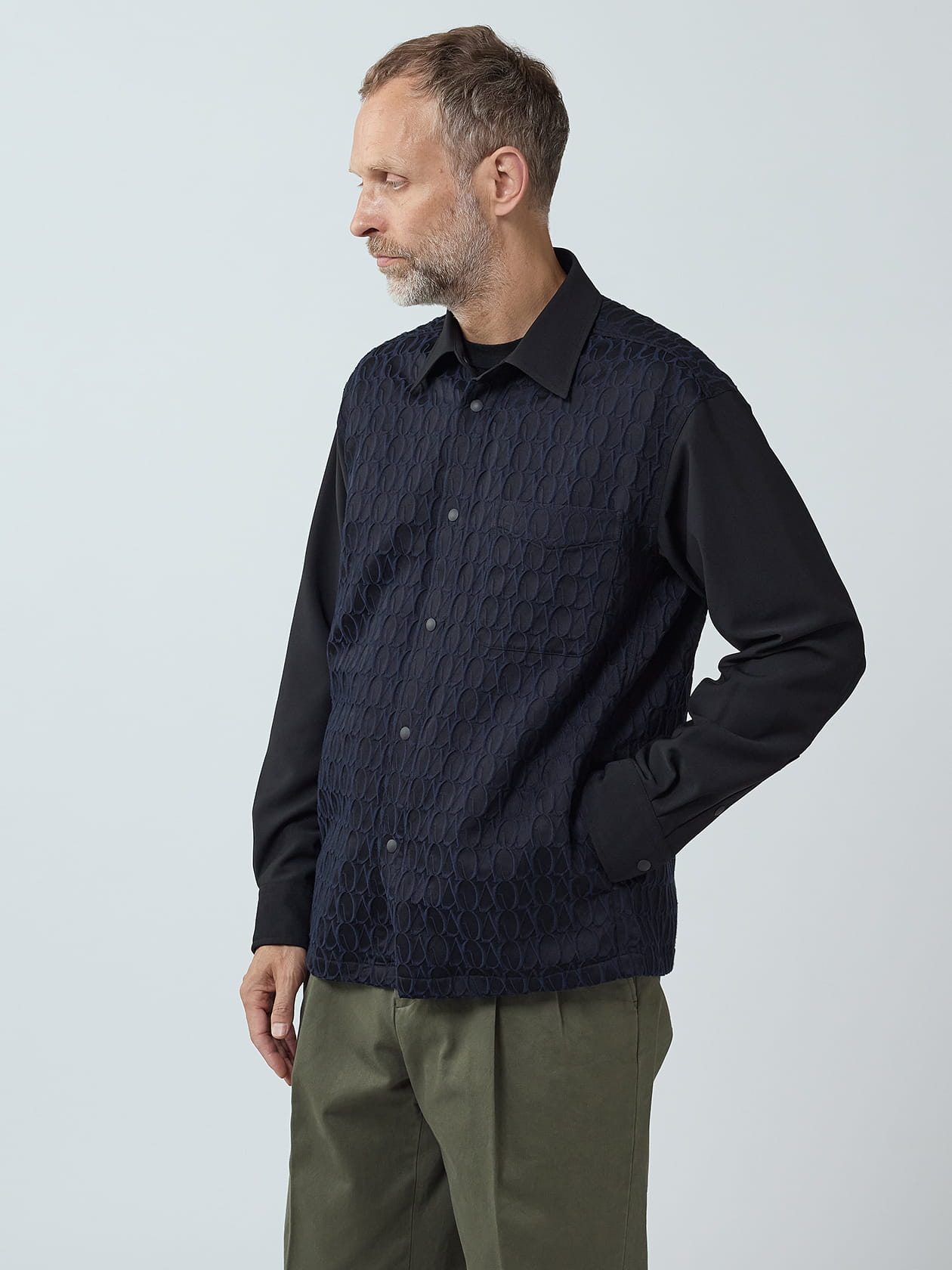 今季のシーズナルロゴを極端な凹凸のジャガード素材で表現したアウター目線のシャツジャケットです。 ヨコ糸に高収縮ポリエステル糸と綿糸を使うことで、両者の伸度の違いから凹凸感を表現。フクレジャガードと呼ばれる素材はジャージー素材にも似た滑らかさとストレッチ性を持つ素材です。 襟と袖に別布を用いた、いわゆる「コンビネーション」仕様のアウターで、袖先にはシャツカフスと剣ボロの付いた本格仕様。 サイドシームについたポケットも柄を邪魔することなくデザインされており、極めつけは、ポケットの袋布に表生地と同じ生地を使っている点です。前を開けて着た際に、内側を見られてもポケットの存在を悟られないよう配慮した仕様で、モノづくりへのこだわりが感じられる1着です。