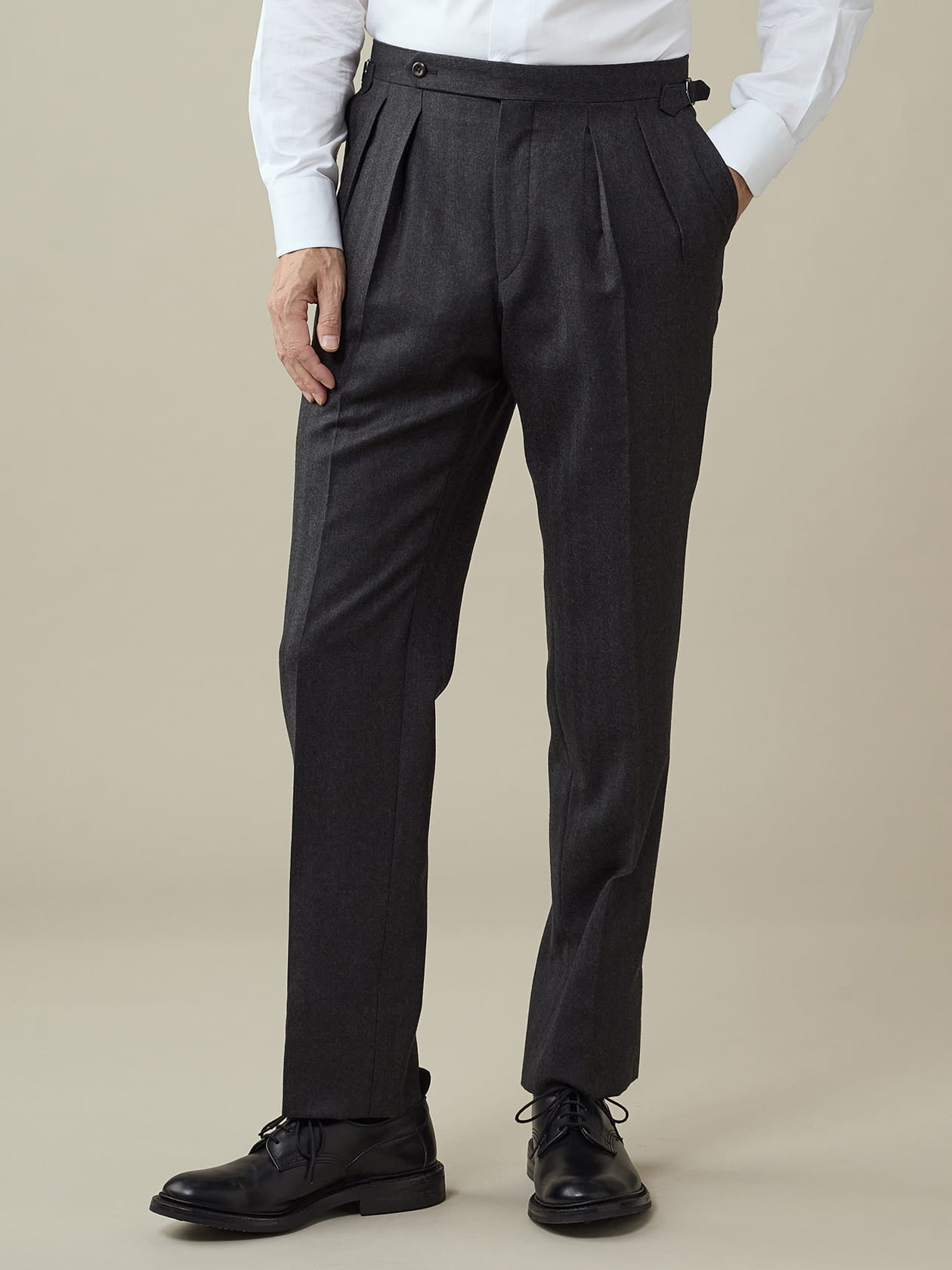 英国ジョン・フォスター社の生地を使用したへリンボンツイルトラウザーズ タテヨコにエクストラファインウール64/2を使用した仕立て映えする生地を、巧みなアイロンワークで立体的に仕上げた美シルエットが魅力の一本です。 ベルトレスでの着用を前提としたサイドアジャスター仕様に、インタックの2プリーツ、フロントの長めの持ち出しなど、1950年代の英国トラウザーズを彷彿とさせるディテールが光ります。 モデル H:185㎝ 着用サイズ:82 ・画像はサンプルのため、実際の商品と若干異なる場合があります ・照明の関係により、実際よりも色味が違って見える場合があります またご利用の環境により、若干製品と画像のカラーが異なる場合もございます ・商品の色味は、商品アップ画像をご参照ください