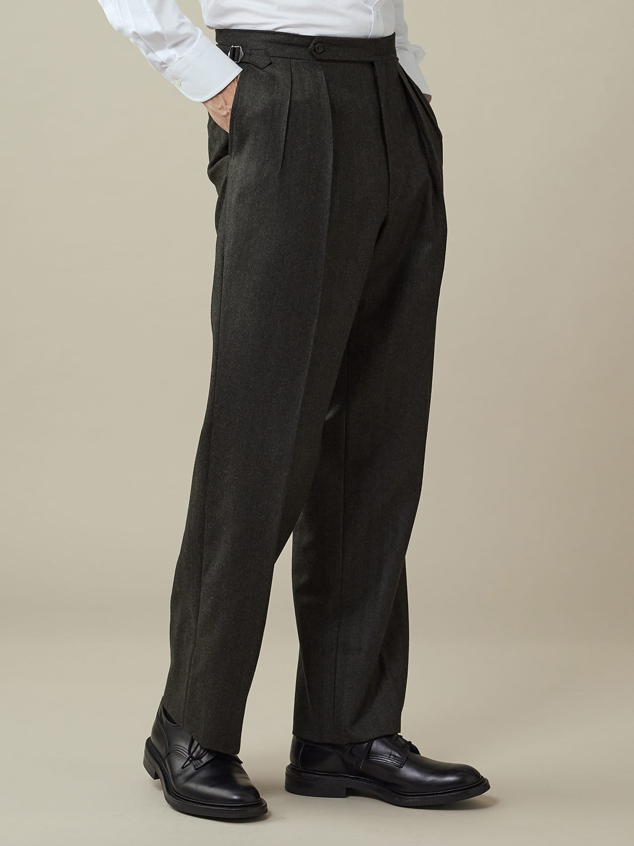 英国ジョン・フォスター社のファブリックを使用したサイレンスーツ型セットアップ。こちらはトラウザーズのご紹介ページです。 英国の元首相ウィンストン・チャーチルが愛用してたサイレンスーツを、上下ばらしてセットアップでご提案。 サイレン(警報)とは第2次世界大戦中の空襲警報の事。部屋着の上から着る防空服として考案された経緯をもとに、渡りから裾口にかけてゆったりと幅をとったシルエットが魅力です。 デザインこそ戦時下を踏襲していますが、深いグリーンが品位を漂わせるラグジュアリーな生地を採用。濃色ながら複雑に絡み合った色と色とが表現するグリーンは、色の奥行というものを如実に感じさせます。 国内だとあまり見かけない緑のヘリンボーンパンツ。MADE IN UKにこだわった珠玉の一本です。 モデル H:185㎝ 着用サイズ:82 ・画像はサンプルのため、実際の商品と若干異なる場合があります ・照明の関係により、実際よりも色味が違って見える場合があります またご利用の環境により、若干製品と画像のカラーが異なる場合もございます ・商品の色味は、商品アップ画像をご参照ください