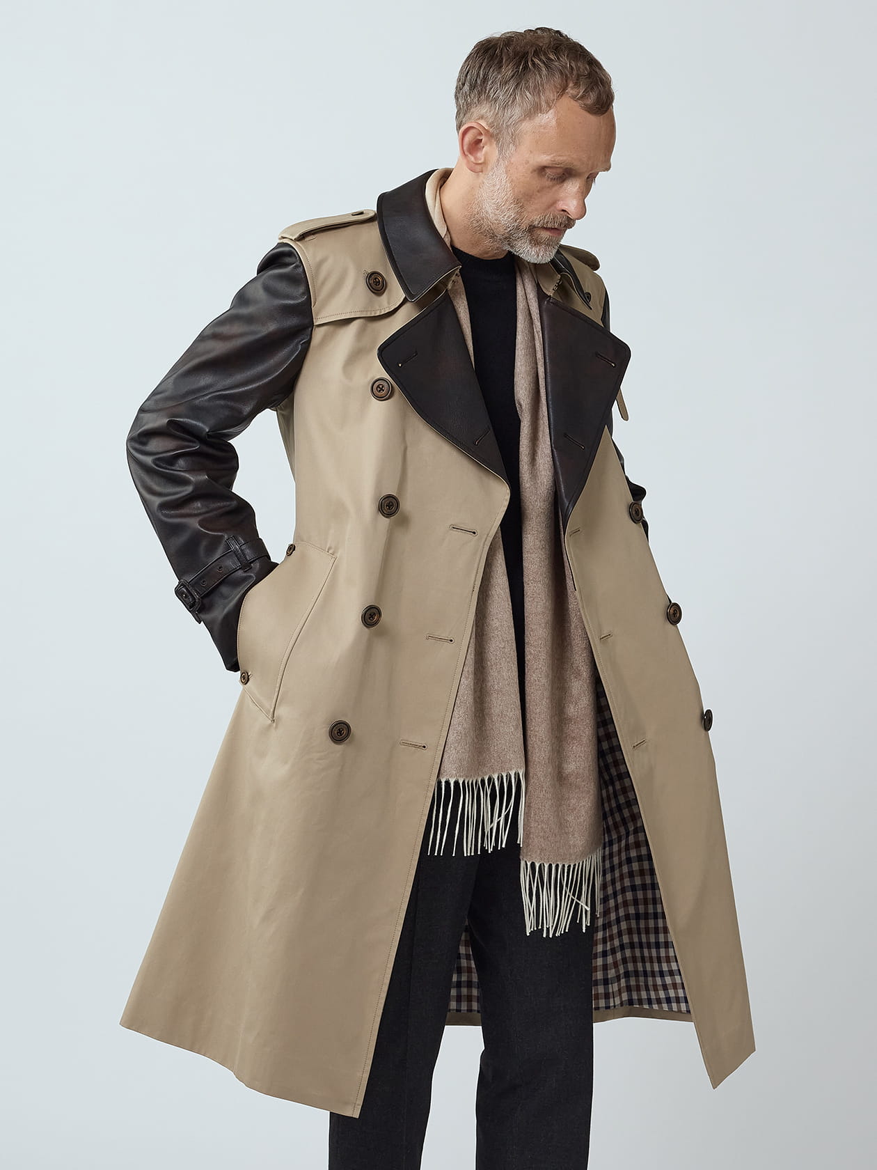 ブランドが誇る革新的な撥水布「AQUA5]とレザーを組み合わせた、今季の目玉と言えるトレンチコート。