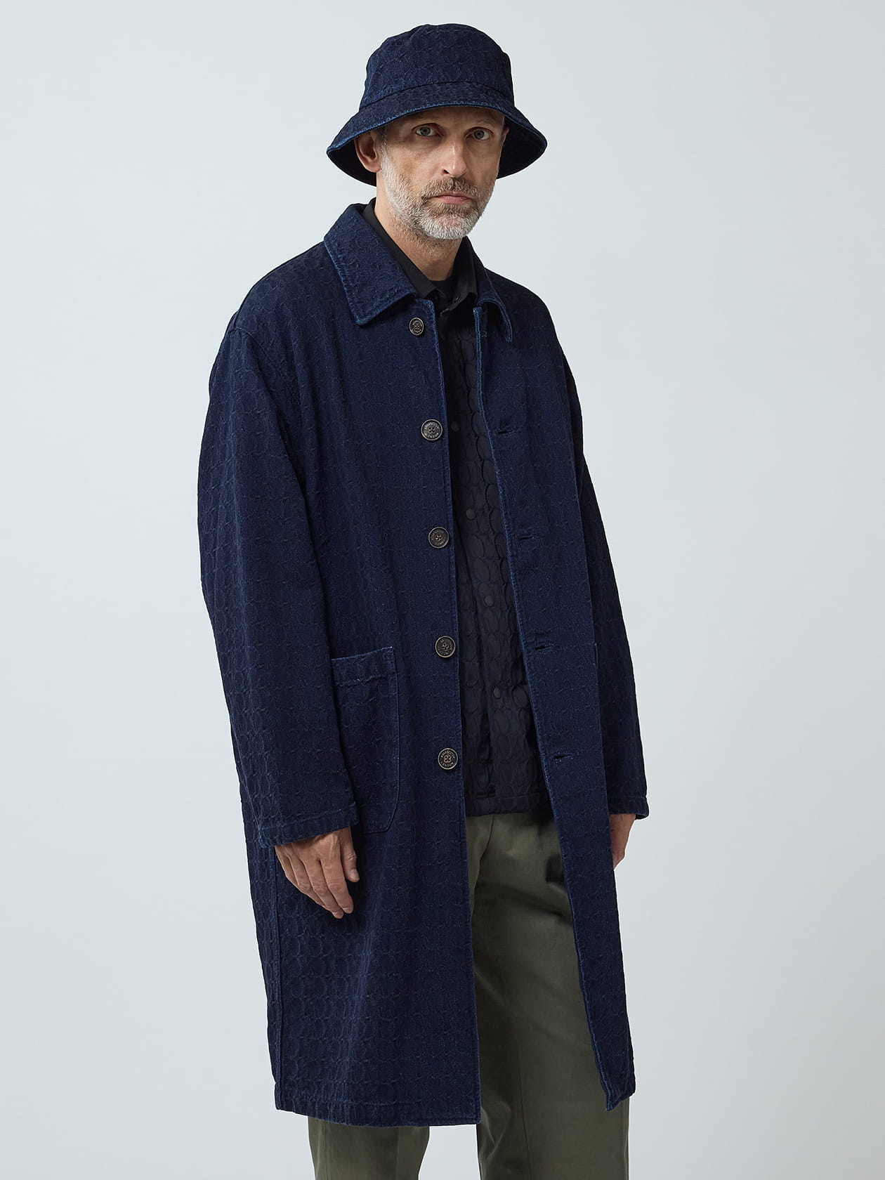 デニムジャガードでブランドロゴを表現したバルカラーコート。名を「Rye(レイ)」。 近年、世界のメンズアパレルシーンで再注目されているデニム生地。経年変化による表情の変化や堅牢さだけでなく、藍染めによる防虫性や美しい発色性も相まって、長く愛せる服地材としてなくてはならない存在です。 そんなデニムの日本における一大産地、岡山にて生産された高品質デニム生地にジャガード柄を表現した、なかなかお目にかかれない逸品。 太番手で厚みのある生地にジャガード織を表現するには相応の太さの針が必要で、織れる織機自体が希少なため洋服として生産される個体数がそもそも少ないデニムジャガード。 そんな希少な生地をオーバーサイズのコートに採用した、贅沢なコートです。