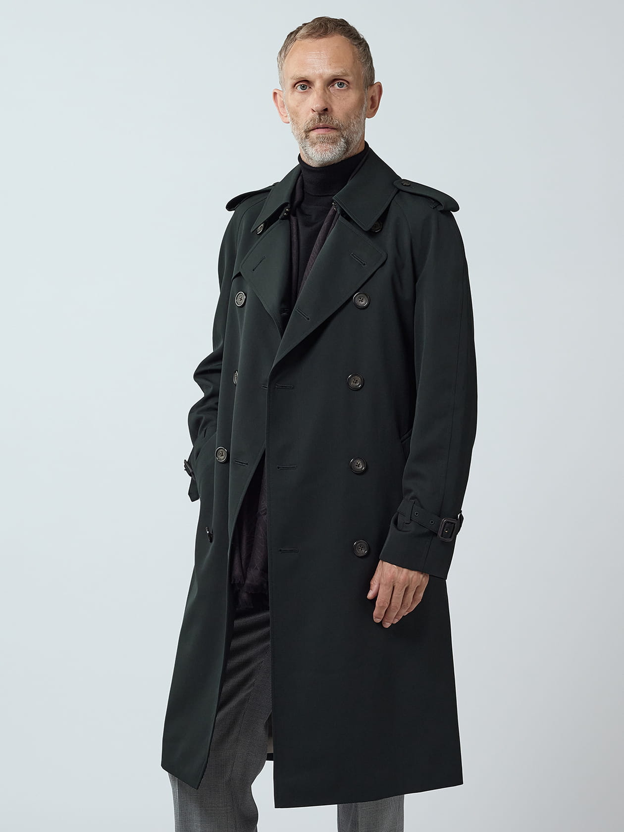 エクストラファインウールの72番手双糸をタテ糸ヨコ糸にそれぞれ使用し、それを高密度に織り上げた生地を用いた「KINGSWAY」 綿生地よりもドレープ性に優れ、長い着丈のエレガントさを如実に感じられる一着。 AQUA5よりもライトウェイトながらも、深みのあるブリテッィシュグリーンが重厚感を湛え、巧みなアイロンワークで作製された各パーツが綿生地では難しい立体的なコートの仕立てを実現。 トレンチコートの醍醐味である撥水性も有した、カジュアル・ビジネス両方に通じる華のある一枚に仕上がりました。