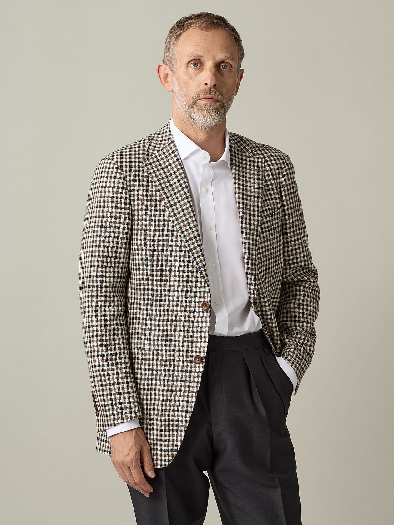 英国の老舗ミルメーカー「MARLING&EVANS」のファブリックを使用し、発表から50周年を向かえるブランドのアイコン柄、クラブチェックを表現した記念すべきジャケットです。 マーリン&エヴァンズは、イタリアンファブリックさながらの柄表現を得意としながらも、英国らしさを失わない生地のコレクションが秀逸なミルメーカー。今回採用した「PADDOCK」はその最たるもので、経糸に2/32ウール×シルク混糸を、緯糸に2/26ウール×リネン混糸を用い、異なる番手と素材の掛け合わせによって立体感と柔らかな質感を見事に同居させています。 ネイビー×ブラウン×ベージュという、秋冬カラーとして用いられることの多い色彩で構成されたクラブチェックですが、老舗ミルにかかればクリアな発色とメリハリある色表現で春夏のさわやかな空気を感じる柄へと昇華。ネイビーとベージュ、ブラウンとベージュが重なるチェック部分において、きめ細やかながらもハッキリと主張してくるやや白寄りのベージュ糸が、この効果を生んでいます。 伝統を大切にしながらも軽やかで洗練された印象を纏う、ブリティッシュの神髄を体現した一着です。