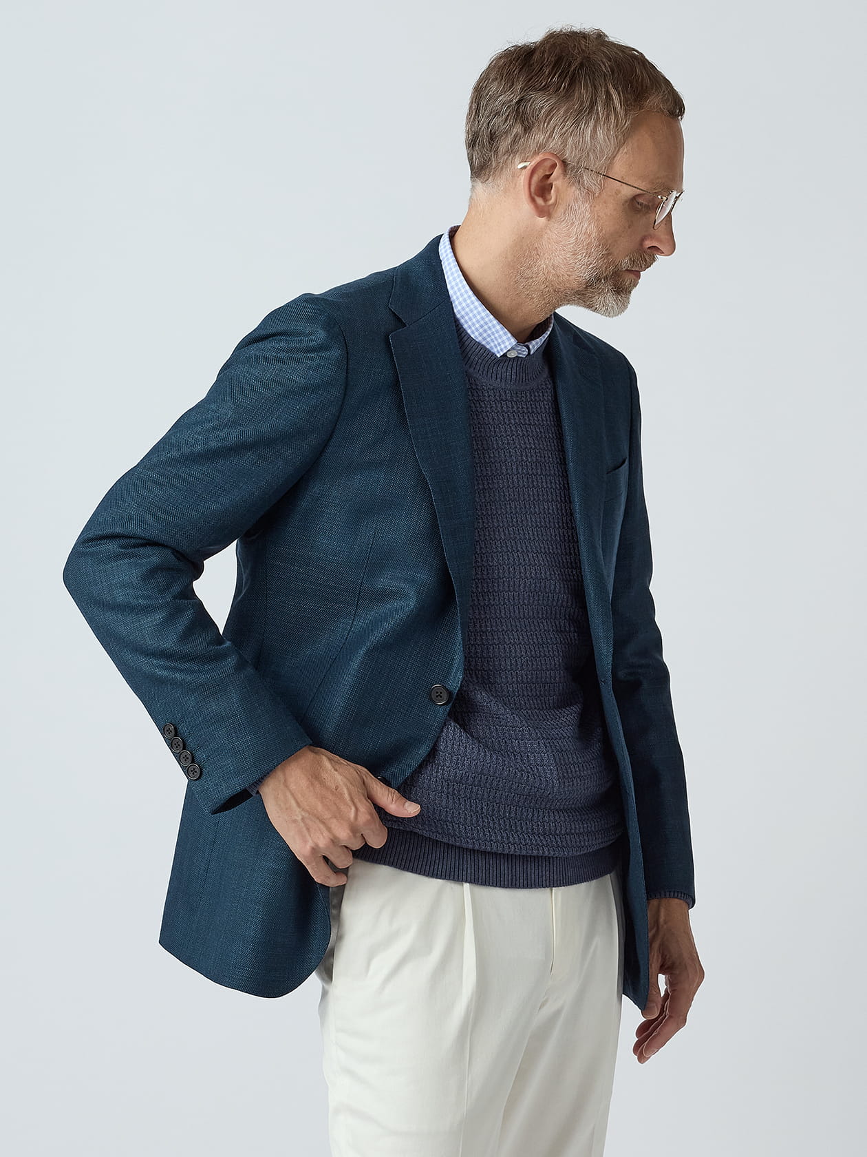 「Ermenegildo Zegna(エルメネジルド・ゼニア)」が手がける、上質なシルクウール生地を使用した特別な一着。 シルクとウール、2種の自然素材をブレンドすることで生まれる、しっとりとした質感とエレガントな光沢が他にはない上品さを演出します。太細の糸を組み合わせた独自の織りによって、生地表面に微細な凹凸と深みのある表情が生まれ、見る角度によって微妙に変化する陰影がラグジュアリーな印象に。 柔らかな肌触りと優れた通気性を備え、着心地は非常に軽快で快適です。ジャケットに最適な240gのウエイトで、シーズンを問わず活躍する汎用性の高さも魅力な1着に仕上がりました。 触れてみて、着てみて、「他とは違う」と素直に感じる事のできる、今シーズン必見の1着です。