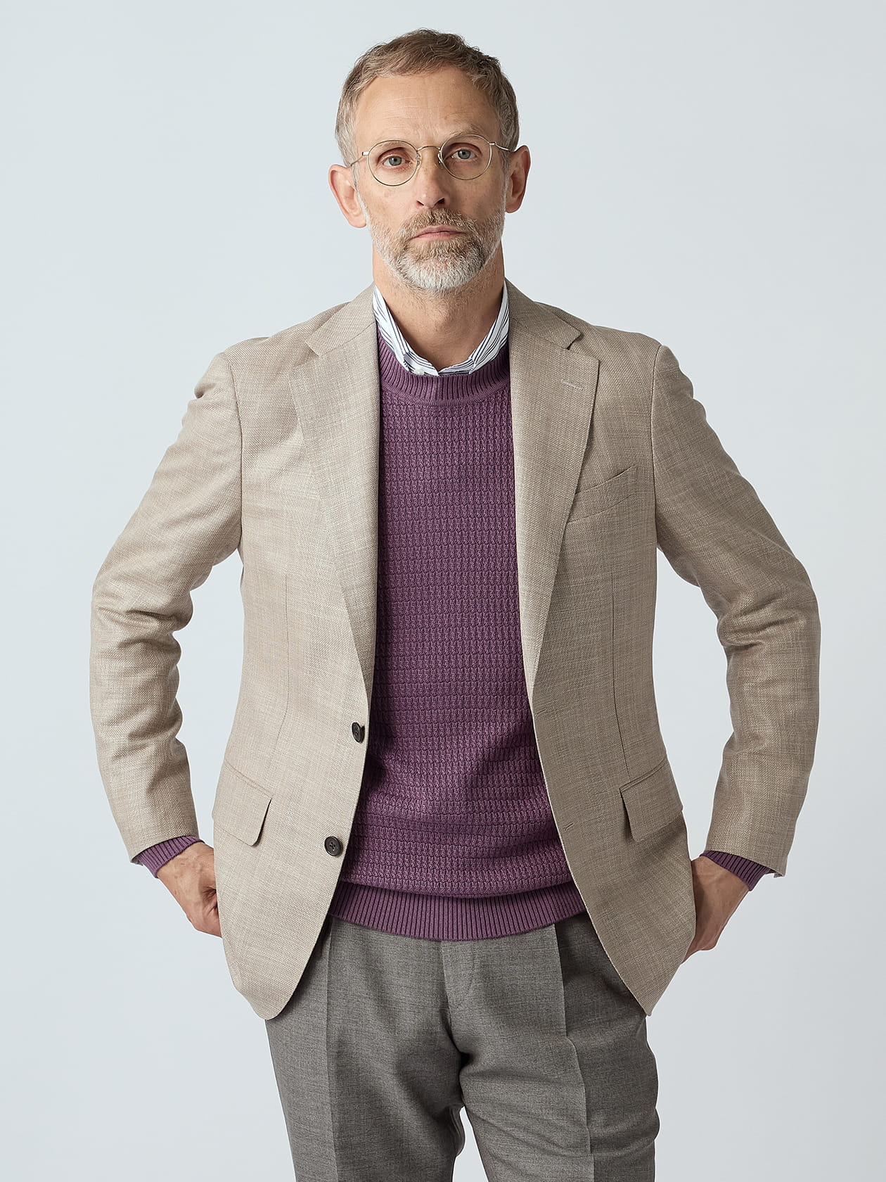 「Ermenegildo Zegna(エルメネジルド・ゼニア)」が手がける、上質なシルクウール生地を使用した特別な一着。 シルクとウール、2種の自然素材をブレンドすることで生まれる、しっとりとした質感とエレガントな光沢が他にはない上品さを演出します。太細の糸を組み合わせた独自の織りによって、生地表面に微細な凹凸と深みのある表情が生まれ、見る角度によって微妙に変化する陰影がラグジュアリーな印象に。 柔らかな肌触りと優れた通気性を備え、着心地は非常に軽快で快適です。ジャケットに最適な240gのウエイトで、シーズンを問わず活躍する汎用性の高さも魅力な1着に仕上がりました。 触れてみて、着てみて、「他とは違う」と素直に感じる事のできる、今シーズン必見の1着です。