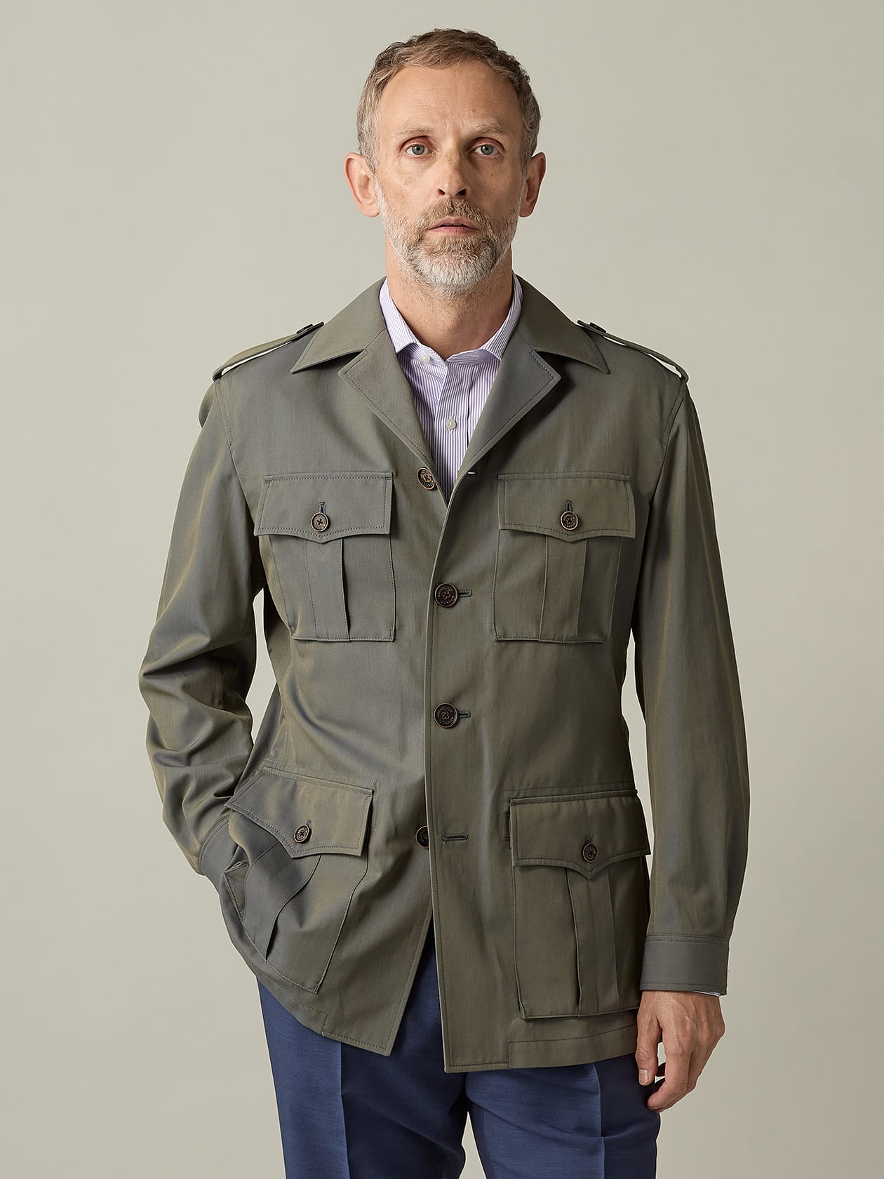 毎年ご好評の英国の伝統的な衣服を提案する「UKコレクション」から、ドーメルの玉虫調生地をもちいたサファリジャケットのご紹介です。 アフリカの藪の中で英国軍が着用していたブッシュジャケットがルーツとされ、国内のハンティングウェアとして人気となっていったサファリジャケット。銃弾や解体用のナイフを入れるための弓なりフラップが付いた多数のポケットや、動きやすさを確保するための背のインバーテッドプリーツなど、他ブランドでは省略されてしまいがちなディテールを余すことなく継承しています。 生地にはカーキ×ブルーの玉虫表現が美しいウール×コットン生地を採用。ドーメル社が提案する「トレンチライト」というの名の生地で、その名の通り、トレンチコートの為に開発された丈夫で軽量なハイテクファブリックです。英国のヨークシャーにて丹念に織られたこの服地は非常にきめ細かく、エレガントで上品な光沢を湛えています。 モードの帝王と謳われた1969年の彼のサファリルックの1ピースでもあるような、ラグジュアリーさと無骨さを同居させた稀有な仕上がりとなっているので、ぜひスラックス合わせで楽しんでいただきたい1着です。