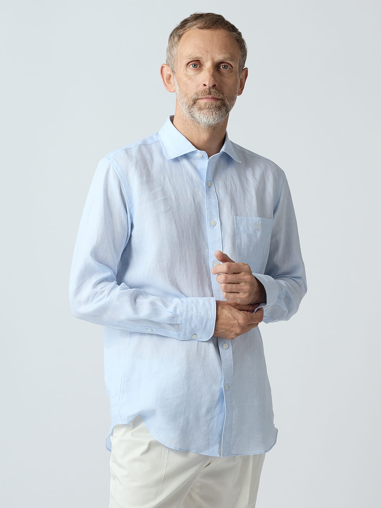 夏の長期化でラグジュアリーマーケットからの注目度が年々増している麻素材。その中でも先染めにこだわった美しいカラーリングで評価を得ている、ポルトガルのソメロス社の生地を用いたリネンシャツをご提案です。 吸水性や速乾性に優れる麻素材は高温多湿な日本の気候に適しており、さらに使うたびに風合いが増していく天然の性能もあり、愛着を持って着用できる注目素材です。 そしてなんといっても、こちらのリネンシャツの魅力はその発色性です。 2026年春夏のシーズンテーマである「キューガーデン」から、夏の英国に咲き誇るデルフィニウムの色調を表現。英国では稀な夏の青空に溶けるようなブルーと、高貴さと可憐さを感じる繊細なパープルの花の色を見事に服地に落とし込んでいます。 リネン素材というとシワを気にされる顧客様も多いかと思いますが、こちらのリネン素材は着こめば着込むほどそのシワが味となってくれる一品。簡単なスチームアイロンでビシッと綺麗に戻りはしますが、どんどん着込んでシワ感ごと楽しむ着こなしをお勧めしたいシャツです。