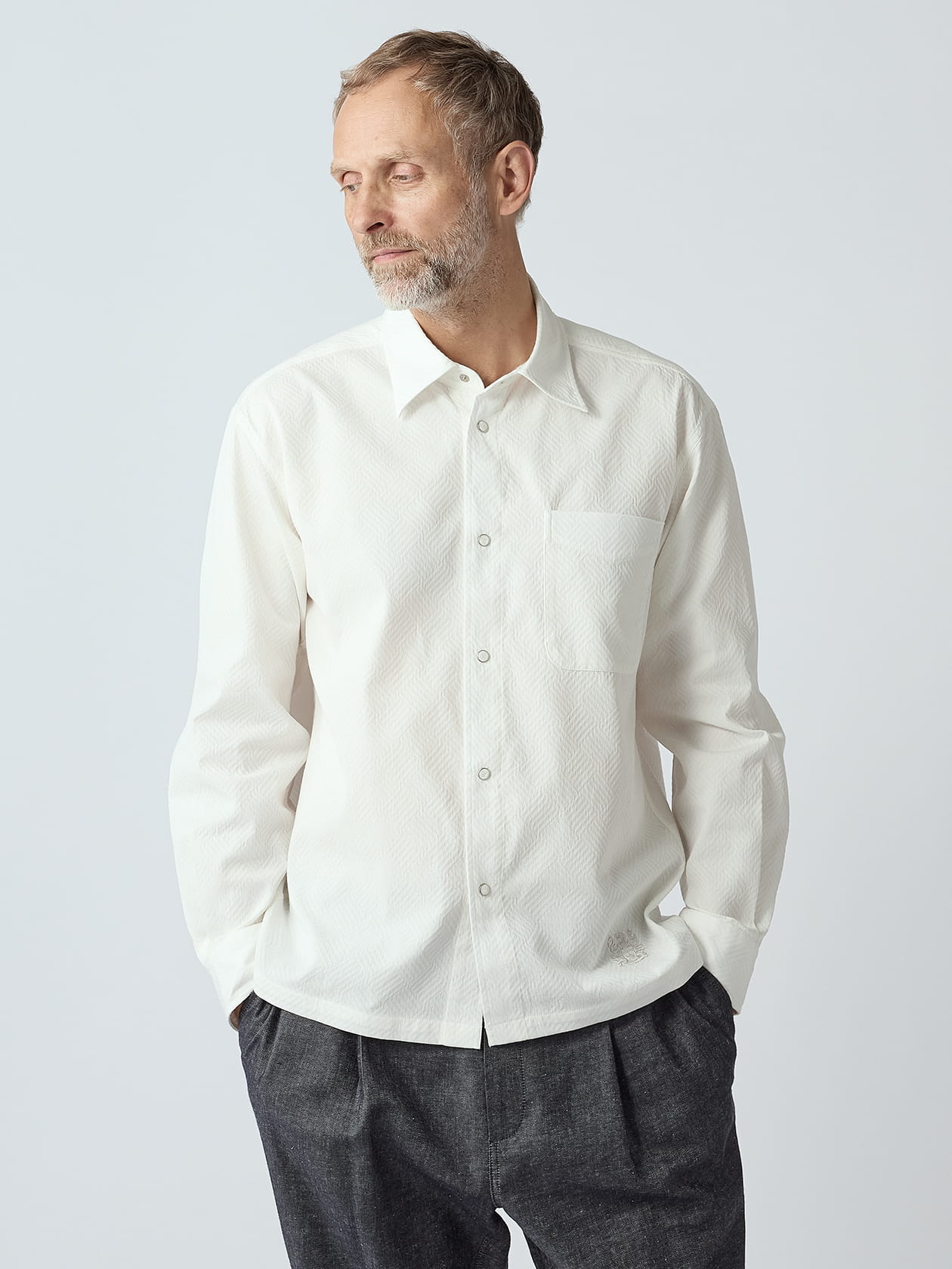 「桐生は日本の機どころ」と言われるように、群馬南部の桐生地方は古くから織物産業で発展してきた地方です。戦後は特に、化学繊維を使用した多様なジャガード織物の生産で有名となったこの地から、ポリエステル×綿の「フクレジャガード素材」を使ったアウターシャツをご紹介です。 フクレジャガードとは、膨らんだジャガード柄によって模様を作る織物の事。一般的な平面のジャガード織に比べて陰影が強調されやすく、色糸を使わなくてもハッキリとした柄を表現できます。 今回はそんなフクレジャガードを手持ち感のある2重織りの生地表面に施し、よりアウター目線のシャツに仕上げました。 色糸を使っていないので遠目には無地のシャツに見えますが、近づくと大胆な斜線が全面に施されているのが分かります。主張しすぎず、埋もれすぎず、生地の高級感を損なわないままに柄を表現する技術は流石の一言です。 白場のシャツであっても胸ポケットや袖カフスなどの柄合わせが見事で、手抜かりない縫製が見て取れます。白の虹彩が美しい白蝶貝を使った釦を採用するなど、細部にまでこだわった一枚です。