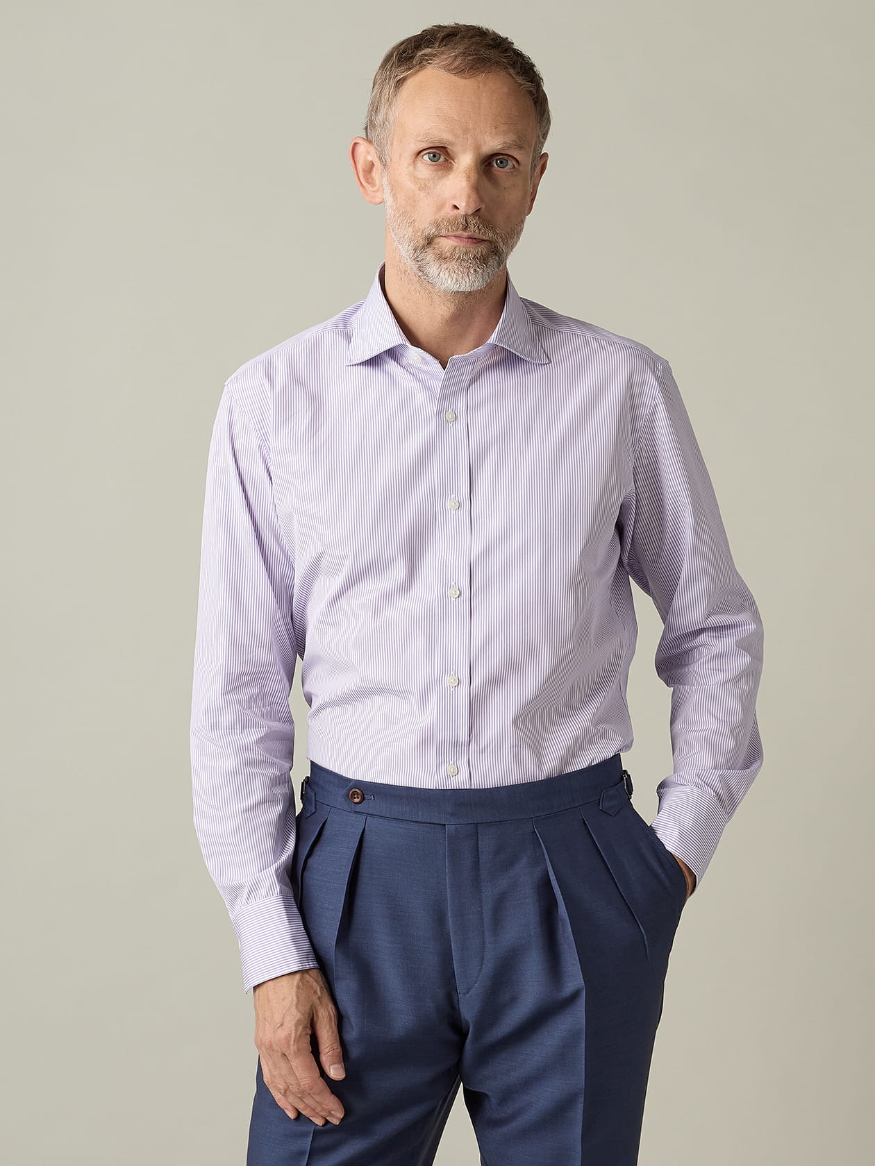 言わずと知れた英国のシャツ生地メーカー「トーマスメイソン社」の120番双糸生地を用いた一枚です。 最近では各セレクトショップなどでも見かけるようになったトーマスメイソンのシャツ。今回はその中でもワンランク上の、織り組織がほとんどわからない程に緻密な生地を用いた1着。肌当たり滑らかで、夏時期に最適なシャツに仕上がっています。 繊細な生地の上に引かれたストライプは白場との境界がはっきりとしており、柔和な色を用いていてもぼやけた印象には決してならない、ただのストライプシャツとは一線を画す色合いを表現しています。 また、特筆すべきは「UK TRADITIONALライン」であるが故の秀逸なパターン(型紙)です。 通常展開している「ドビーマルチストライプシャツ(2206225001)」などと見比べると分かりやすいですが、背面のヨーク部分のストライプが、横方向ではなく中央を起点に斜め方向へ走っている事が分かります。これは英国の伝統的なシャツの特徴で、バイアス取り(斜め裁断)した2枚の生地でヨークを成型することで、肩甲骨の動きに沿った伸度を発揮する仕様に仕上げているのです。 また、後ろから見た時に襟とヨークの境目部分と、折り返ってきた襟の端部分がぴったり重なるのも英国らしいシャツの特徴。米国シャツやフレンチシャツは、第一ボタンを開けて着た際に襟が後方へ逃げるようなシルエットとなりますが、英国シャツはうなじにピタッと張り付くようなシルエットとなります。こうする事で、より紳士然としたキッチリした印象をもたらせるのが魅力なのです。 「UK TRADITIONALライン」の名に恥じない、英国シャツの魅力に満ちた仕上がりは一見の価値ありです。
