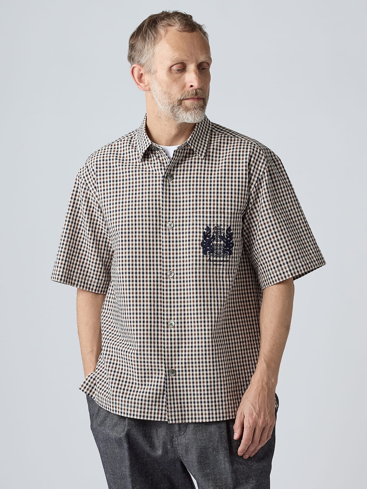 ブランドアイコンであるクラブチェックが発表されてから50年。アニバーサリーイヤーとなる2026年を記念して、ミニクラブチェックの半袖アウターシャツが登場です。 綿とアセテートを組み合わせた新しい素材で生産された半袖シャツは、汗をかいても肌離れが良く、高温多湿な日本の夏に嬉しい清涼素材です。 タテ糸に綿(スパン糸)、ヨコ糸にアセテート(フィラメント糸)の、組成が違う糸を織り込んでシアサッカー組織を作っていますが、これは高い技術力を要する作業です。 スパン糸とは短い繊維を撚り合わせて作った糸の事で、毛羽があり、柔らかくて肌なじみが良いのが特徴。フィラメント糸は長い繊維を撚り合わせた、光沢と強度を持った糸の事です。この両者を掛け合わせて、光沢がありつつも肌なじみが良く、柔らかくも強度を持った生地を生産。爽やかで涼しい着心地と、繰り返しの洗濯でもへこたれない半袖シャツに仕上がりましたので、夏場に重宝する1着となりました。