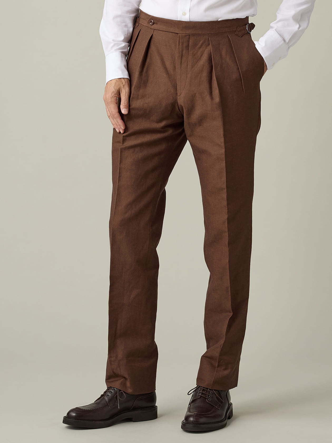 英国のハダースフィールドに居を構え、丁寧な織生地を作る事で知られるB・ローバック社のパナマ織り生地を用いたセットアップ。こちらはトラウザーズのご紹介ページです。 冬のカシミヤ混生地が有名な同社ですが、近年大規模な資金投資を経て、夏のリネン混生地にも精力的に取り組んでいる事でも知られています。オーガニックコットンとリネンを交織したこちらの生地は、もっちりとした肌触りと通気性を兼ね、着るたびに肌になじんでいく経年変化が魅力の一枚です。 ウールのブラウンが持つ柔らかな光沢とはまた一味違う、綿特有のカントリーな趣き漂う発色は、ブラウン好きなら琴線に触れる事必至なアイテム。ベルトループではなくサイドアジャスターで履く仕様も相まって、古き良き英国の物づくりを感じられる特別な一本に仕上がりました。