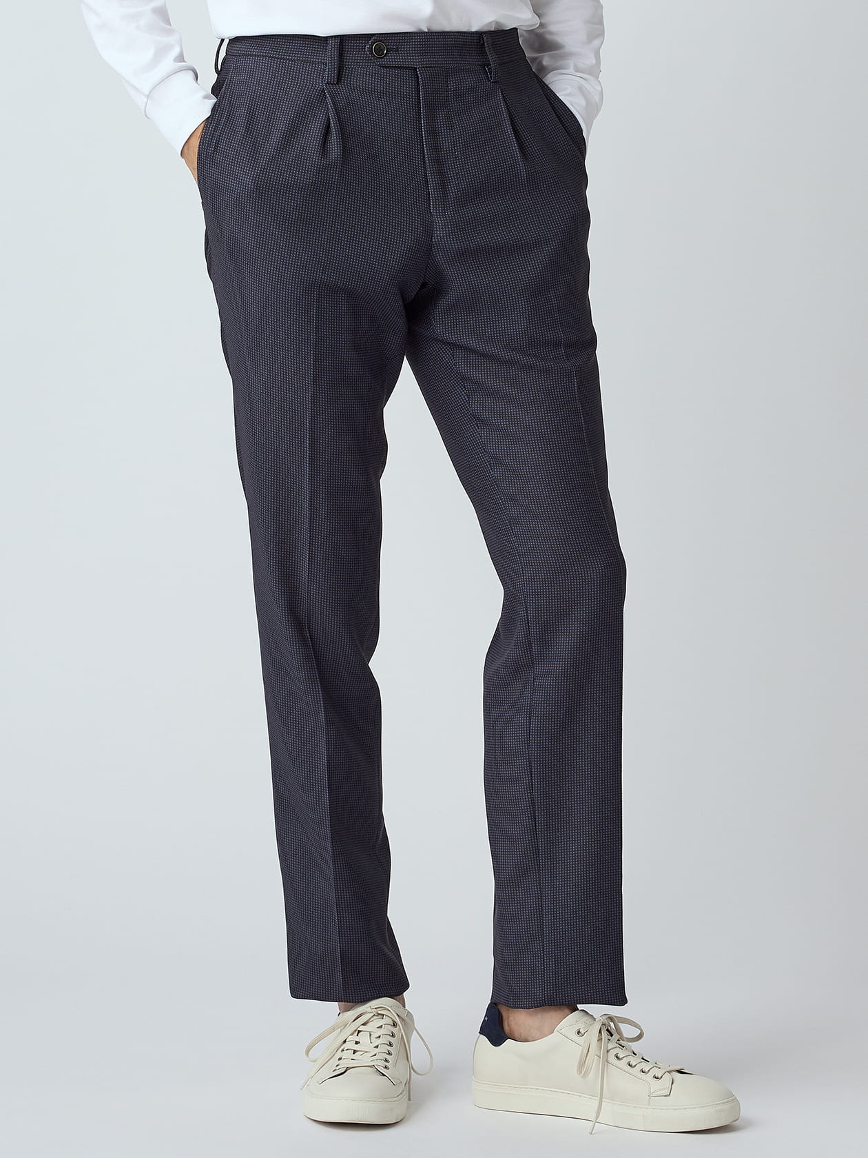 ご家庭洗濯可能な手軽さが魅力の「TEC.3」シリーズから、特殊な生地を用いたネイビーとライトグレーの大本命セットアップが登場。こちらはパンツの紹介ページです。 特殊な織機を用いて経糸をねじり合わせながら緯糸を通していく「カラミ織り」は、古くから日本にも根付いてきた織物で、夏の着物やお坊さんの法衣などに用いられてきた清涼生地です。 その魅力は何と言っても通気性。光に晒すと向こう側が透けて見えるほどの軽量さで、必然的に空気の通りもよく、夏時期でもセットアップを着なければならない方にはぴったりの一着に仕上がりました。 セットアップを仕立てるにあたり、通気性は嬉しいものの透け感は少し抑える必要があったので、使い勝手のいい小ぶりな千鳥格子を表地にプリント。パンツにはさらに裏地を当てる事で透けを防止し、ネイビーとライトグレーという定番色を採用する事で主役級のセットアップとなりました。 見た目には英国スーツさながらの堅実さを持ちながら、履くとちょっと驚くぐらいの軽さであるカラミ織りスラックス。高温多湿な日本の夏に心強い、ジャリっとした質感と肌離れの良さを是非ご体感ください。