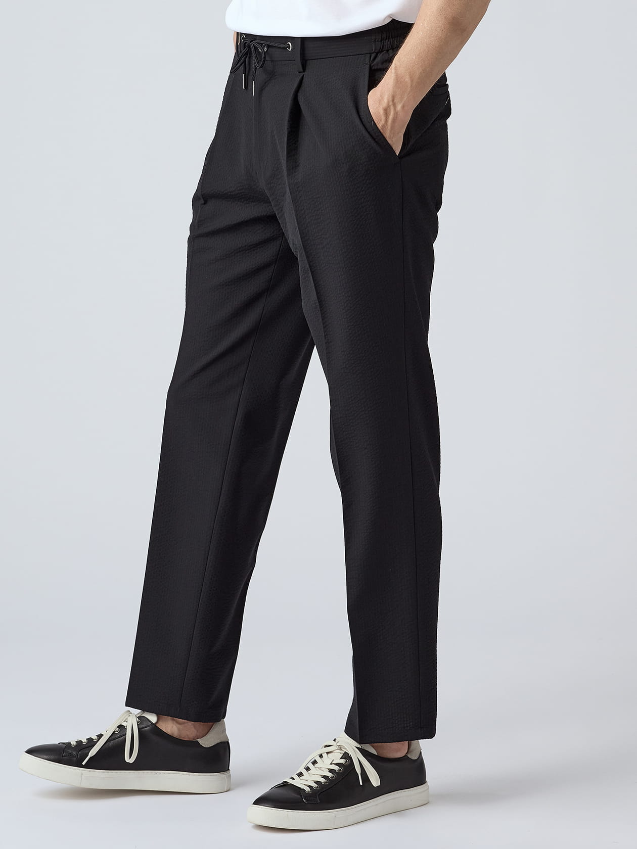 ご家庭洗濯可能な手軽さが魅力の「TEC.3」シリーズから、アクアスキュータムが提案するハイエンドなシアサッカーセットアップをご紹介。こちらはパンツのご紹介ページです。 他ブランドではあまり見ないウール配合のシアサッカー生地は、化繊だけではなかなか表現できない上品な光沢とドレープ感が魅力の1着です。通常、サッカー生地にウールを配合すると重くなりがちですが、上質な繊維から紡いだウール糸を使用する事で、盛夏アイテムらしい軽量さを実現しました。 化繊のパンツとウールスラックスの見た目の違いは「落ち感」とも言われる生地の揺れ方や滑らかさの違いに由来するもの。盛夏のシアサッカー生地且つ伸度のあるポリウレタン配合の手軽なパンツでありながら、ウールスラックスさながらの落ち感を湛えたこだわりに満ちた1本に仕上がりました。 使い勝手のいい万能なブラックと、26年春夏のシーズンテーマから、ハーブティーとして名高いイギリスの夏の花「ブルーマロウ」を彷彿とさせるやや紫がかった水色の2色でリリース。セットアップ展開の同色同生地ジャケットと合わせて、上品な夏スタイルを楽しめます。