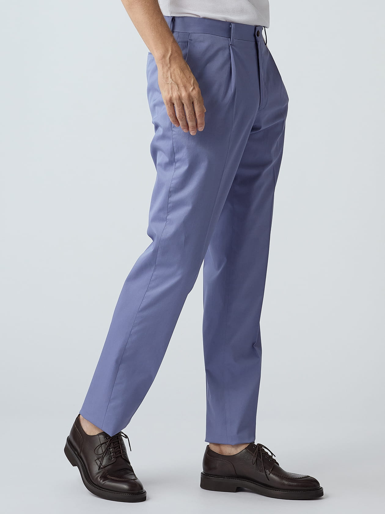 毎年ご好評のストレッチツイル生地を用いたチノパンツ。今年は涼やかな3色でのご提案です。 細番手の糸で織り上げた生地表面にピーチスキン加工を薄く施した一本。光の当たる部分に陰影が生まれる事で素材由来の光沢感が底上げされ、上品な印象のチノパンに仕上げました。 見た目にはハリ感のある素材ですが、甘撚りの糸を使用する事で触れると柔らかさを実感でき、肌当たりも滑らかな仕上がりに。 定番のベージュ・ネイビーに加え、英国に春の訪れを告げる花、「イングリッシュ・ブルーベル」の青紫色を表現した一本が登場です。