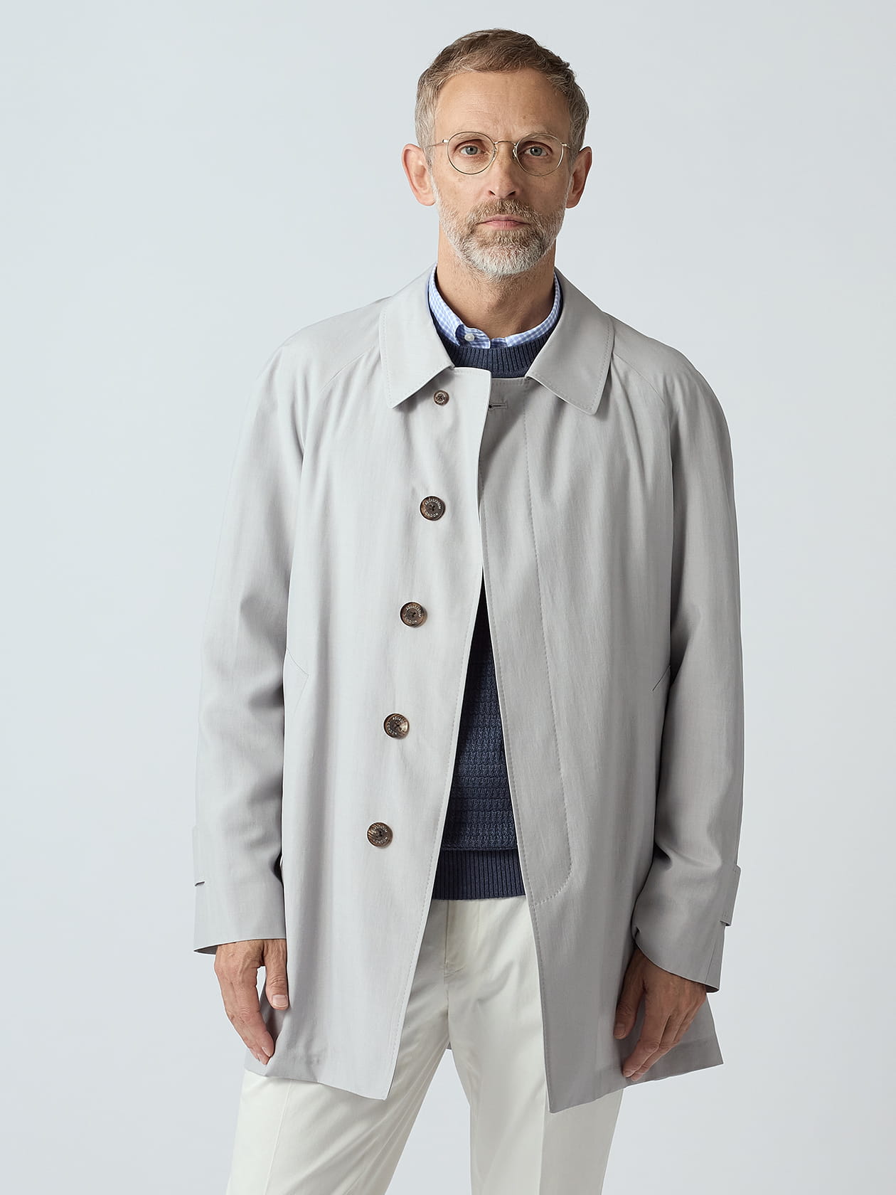 ピュアシルク100%のラグジュアリーバルマカーンコートのご紹介です。 シルク特有の滑らかな手触りと美しい光沢が表現された生地を、伝統のステンカラーコート「Filey」に落とし込んだ1着です。 英国のスパイと言えば「007」シリーズのジェームズ・ボンドが有名ですが、彼のアンチテーゼとして誕生した「ハリー・パーマー」も根強い人気を誇ります。飄々としたキャラクターが人気の彼が劇中で纏った一枚こそ、アクアスキュータムのロング丈ステンカラーコート「Filey」であったと言われています。 そんな、ブランドの中でも特別な1着である「Filey」をシルクで仕立てたこちらの「Filey Short」は、素材のドレープ感を生かす為にあえて着丈を短くし、春にサラッと羽織るのに最適なシルエットに仕上げました。 また、今回採用した素材の強みは、シルクでありながら水に強いという点。通常のシルクは水に濡れると白色現象を引き起こしたり光沢を損なったりしてしまいますが、こちらの素材は特殊構造を持った繊維を使用する事で風合いを保てる機構を有しています。季節の変わり目に崩れがちな天気の中でも羽織っていける「アクア=水の スキュータム=盾」の名に恥じない仕上がりとなりました。 モデル H:185㎝ 着用サイズ:38