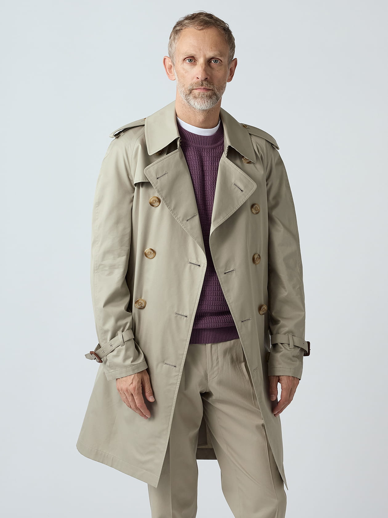 今季シーズンテーマである「キューガーデン」を擁する高級住宅街”リッチモンド”から名前をとった、175周年記念モデルのトレンチコートです。 ストレートのバックヨーク、ウエストベルトの6連ステッチ、3枚袖仕様にインバーテッドプリーツなど、「KINGSWAY」が持つトレンチコート特有のディテールは踏襲しつつ、着丈と袖周りを調整。よりタウンユースに使いやすいシルエットに仕上げました。 そしてなんといっても、目を引くカラーリングがこのコート最大の魅力。 37カラー(ブルー)をつけられた深い色合いは遠目にはパープルに見える玉虫調の色彩を採用。 力強さの象徴である「赤」と、安寧を示す「青」を混ぜる事で生まれる「紫」は、古くから英国王室を代表するカラーでもあります。そんな高貴な色を再現するために、天然素材の中でも無二の光沢と色彩を放つシルク糸を配合。縦糸に青、緯糸に赤みがかったオレンジを通すことで深みのあるロイヤルパープルを表現しており、紫を使用せずに紫を表現した、服地の面白さと奥深さを感じさせる一着です。 82カラー(ベージュ)の明るい色は、グレーの色糸を緯糸に通すことで、軽量素材ながらもコットン100%生地のような重厚感ある色調を表現。シルクやポリエステルの光沢を添えると軽薄なイメージになりがちなベージュを、175周年モデルにふさわしい色調へ導いています。 アクアスキュータム定番の撥水布「AQUA5」のベージュにはオレンジの色糸を用いていますが、それよりも少し彩度の低い、落ち着いた色合いが癖になる一着に仕上がりました。