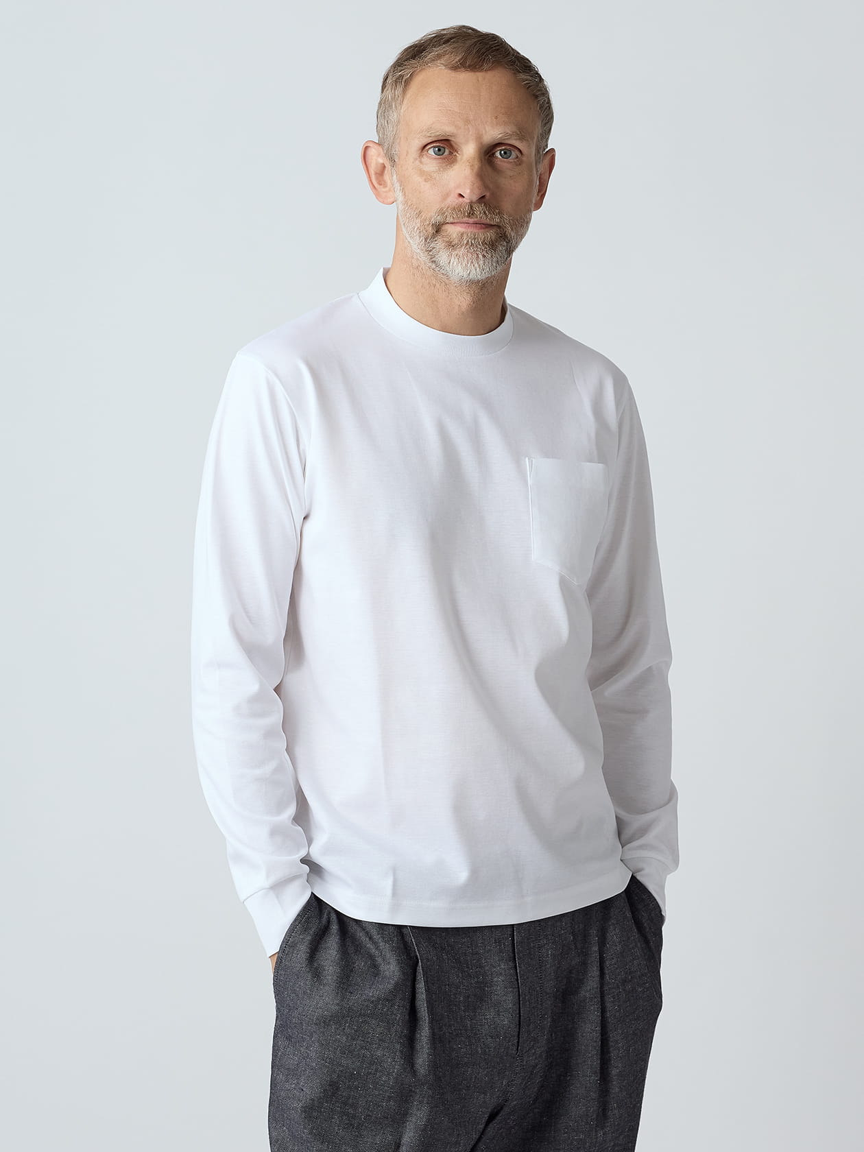 高級綿繊維として名高い超長綿の1種「スーピマコットン」を贅沢に使用した長袖Tシャツをご紹介です。 26年春夏のテーマである英国庭園「キューガーデン」をモチーフとした色とりどりなアウター類のお供として、なにかと有用な白と黒の定番2色をロンTでご用意いたしました。 ジャケットインを想定し、襟フライスの後ろを高く設計する事でジャケット襟の汗汚れを防止できる優れもの。袖山も絶妙な高さで取り付ける事でリラックス感とキチンと感を両立した秀逸なパターンです。 超長綿の高級繊維を紡いだ細い糸を、32ゲージのハイゲージで密に編みたてる事で心強い手持ち感を表現し、透け感に強く、安心して1枚で着られるTシャツを目指しました。生地をよく見ると濃淡の色糸を交編して無地を表現しており、無彩色のモノトーンをラグジュアリーに演出しています。 最高品質のバイオシルケット加工を施した光沢に満ちた生地は紫外線防止機能も備えており、高級感と機能性を兼ね備えた、ワンランク上のカットソーです。