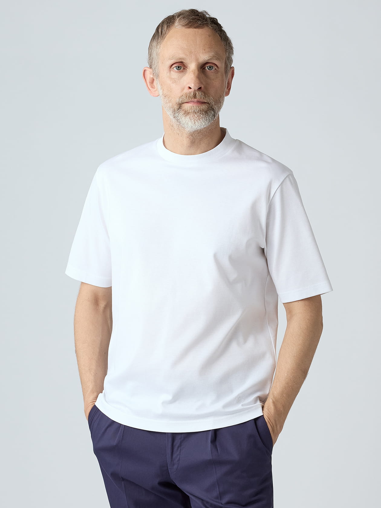 高級綿繊維として名高い超長綿の1種「スーピマコットン」を贅沢に使用した半袖Tシャツをご紹介です。 26年春夏のテーマである英国庭園「キューガーデン」をモチーフとした色とりどりなアウター類のお供に重宝するシリーズ。なにかと有用な白と黒の定番2色に加え、一枚着にも重宝するブルーの3色で半袖Tシャツをご用意しました。 襟フライスの後ろを高く設計し、ジャケットへの汗汚れを配慮した優れもの。袖山も絶妙な高さで取り付ける事でリラックス感とキチンと感を両立した秀逸なパターンが魅力です。 超長綿の高級繊維を紡いだ細い糸を、32ゲージのハイゲージで密に編みたてる事で心強い手持ち感を表現し、透け感に強く、安心して1枚で着られるTシャツを目指しました。生地をよく見ると濃淡の色糸を交編して無地を表現しており、奥行ある色調が上品さを演出しています。 最高品質のバイオシルケット加工を施した光沢に満ちた生地は紫外線防止機能も備えており、高級感と機能性を兼ね備えた、ワンランク上のカットソーに仕上がりました。