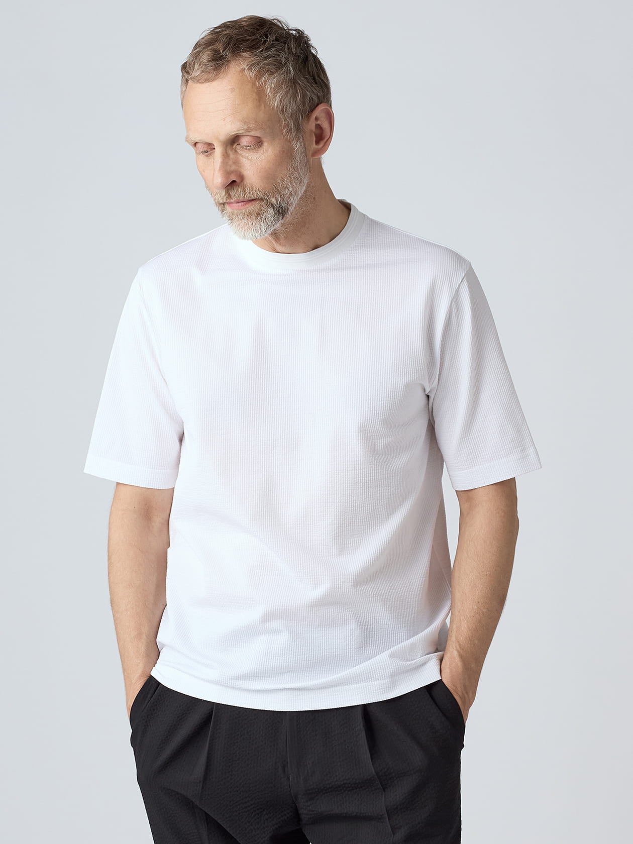 36ゲージの超ハイゲージ編機で仕立てた、上品さと快適さを兼ね合わせた新世代のシアサッカーTシャツが登場です。 細かな凹凸が特徴的な「COOLMAXニットサッカー」素材をヨコ編み(=ニット製品と同じ組織)で成型。ニットならではの優れたストレッチ性と柔らかさを持ちながら、シアサッカー特有の着心地の良さををも兼ねたハイテクウェアです。 適度な肉感を持たせているので透けの気にならなさや強度にも定評があり、高温多湿な日本の夏に1着あると心強いインナーに仕上がりました。 夏場のTシャツにお困りの方にはまず手に取って頂きたい、今季お勧めの1枚です。