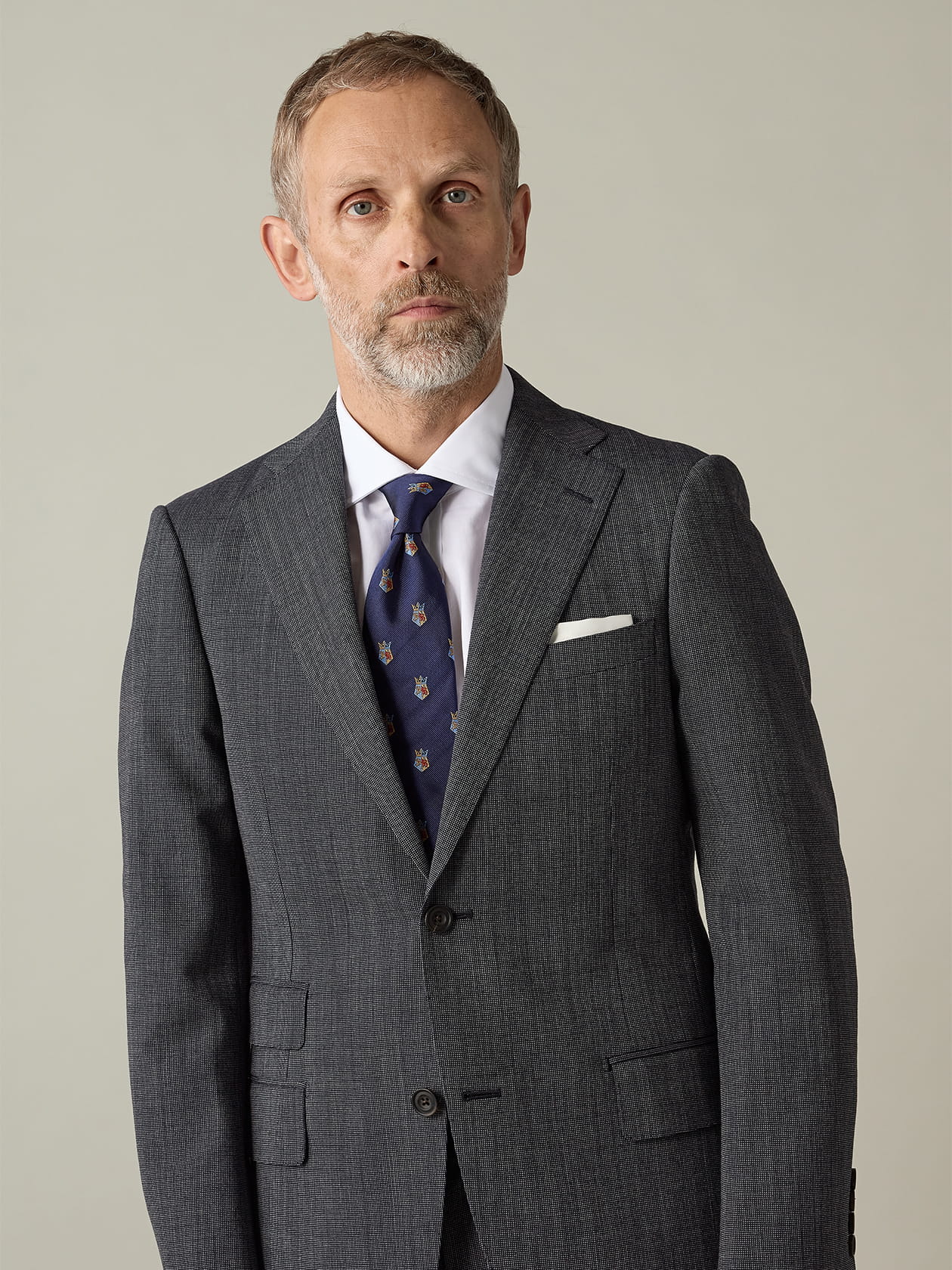 過去のアーカイブから採用したブランドクレストを刺繍したネクタイです。 薄く施したレジメンタルの上に、黄色と水色を印象的に用いたアーカイブクレストを配置。さりげなくも確かなブランドらしさを漂わせるアクセサリーズです。