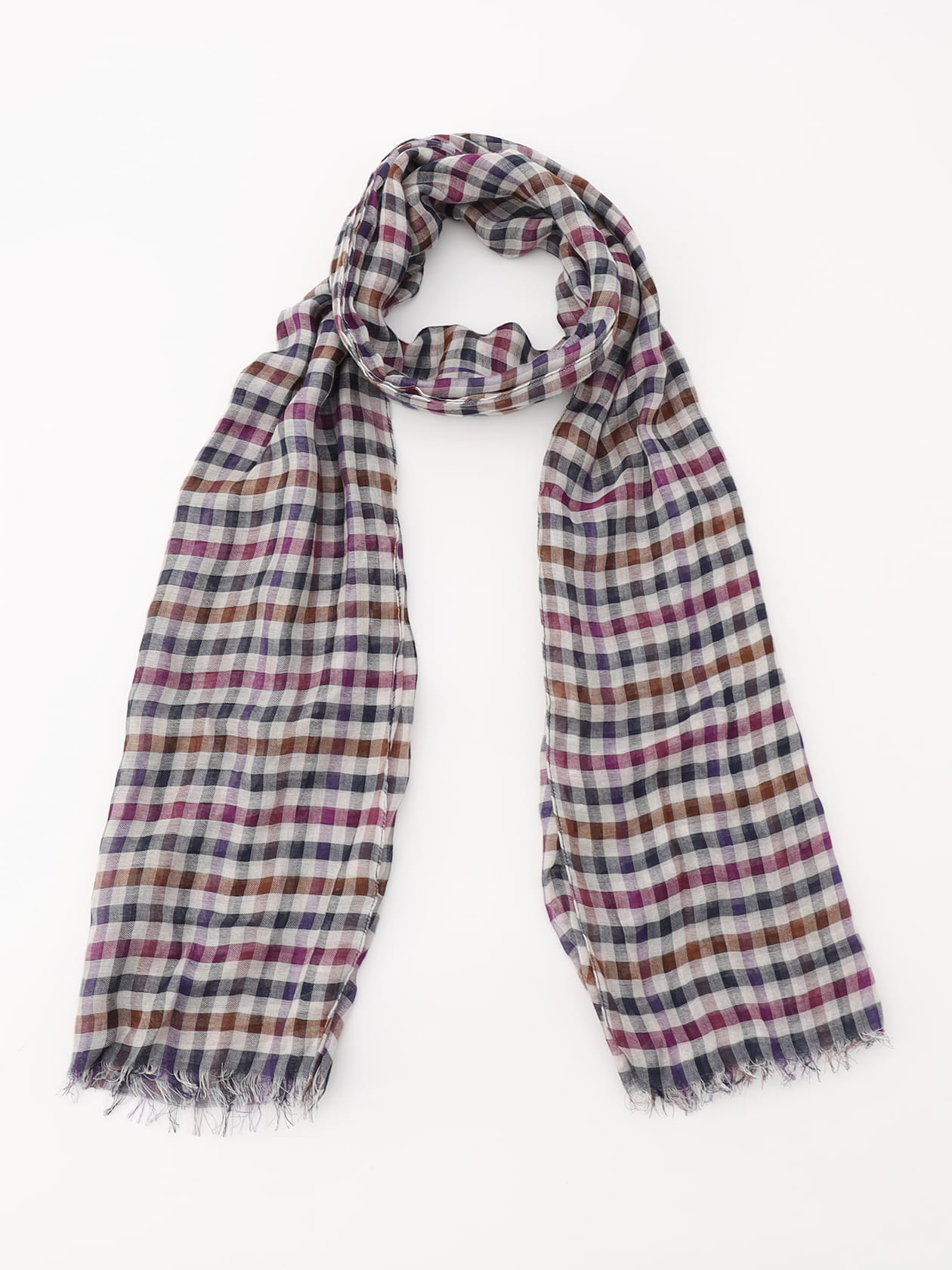 ブランド創業175thを記念して書き下ろされた、伝統のクラブチェックにイングリッシュパープルのラインを差した「<175th limited>Club Check 」柄のストールです。 レーヨン×コットンのふんわりとした生地感が魅力の一本で「コートは着るけどマフラーまでは大げさ」という時期にはぜひご使用いただきたいアイテムです。 というのも、コートの襟周りに付く汗ジミは沈着してしまうとクリーニングでもなかなか取る事が難しく、また、パーツごと交換するのも難しい部位の為、襟汚れはなるべく避けていただきたく、その際に活躍するのが薄手のストールとなるのです。 着物でいう襦袢のように、肌と洋服との間に一枚ストールを挟む癖を付けていただけると、一生モノのコートを長く楽しむことができますので、暖かくなってきた時期にはマフラーではなく、ストールを巻くスタイルを推奨しております。