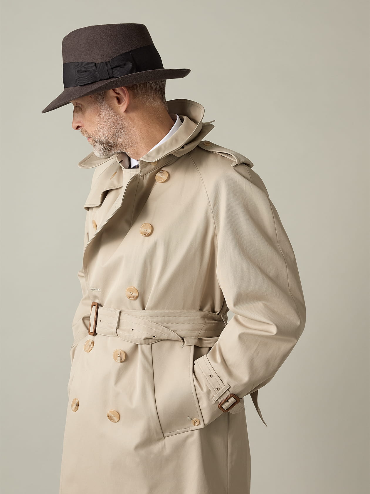 創業から175周年を迎えたアクアスキュータム。長い歴史の中で、様々な著名人がそのプロダクトに袖を通してきました。政治家、軍人、ミュージシャン、映画スター、スポーツ選手etc... とりわけ、映画「SAMURAI」の中でアラン・ドロンが演じたジェフ・コステロのスタイルは特に人気が高く、1967年当時、ファッショニスタから熱烈な支持を集めたと言われています。 175周年を記念して復刻された名盤トレンチコート「SAMURAI」のリリースに合わせ、劇中でアラン・ドロンがかぶっていたホンブルク帽も再現してローンチ。 ウール100%の英国らしい生地を用いながら、つばのフロントに緊張感ある直線を、バッグサイドにはロールした曲線美を採用した色気を纏うシルエットが特徴です。 グレーとブラウンを混ぜたようなアンニュイな色調と、印象的な太いリボン。街灯に照らされたときに浮かぶ均一な毛並みなど、劇中の衣装を現代に蘇らせた逸品です。