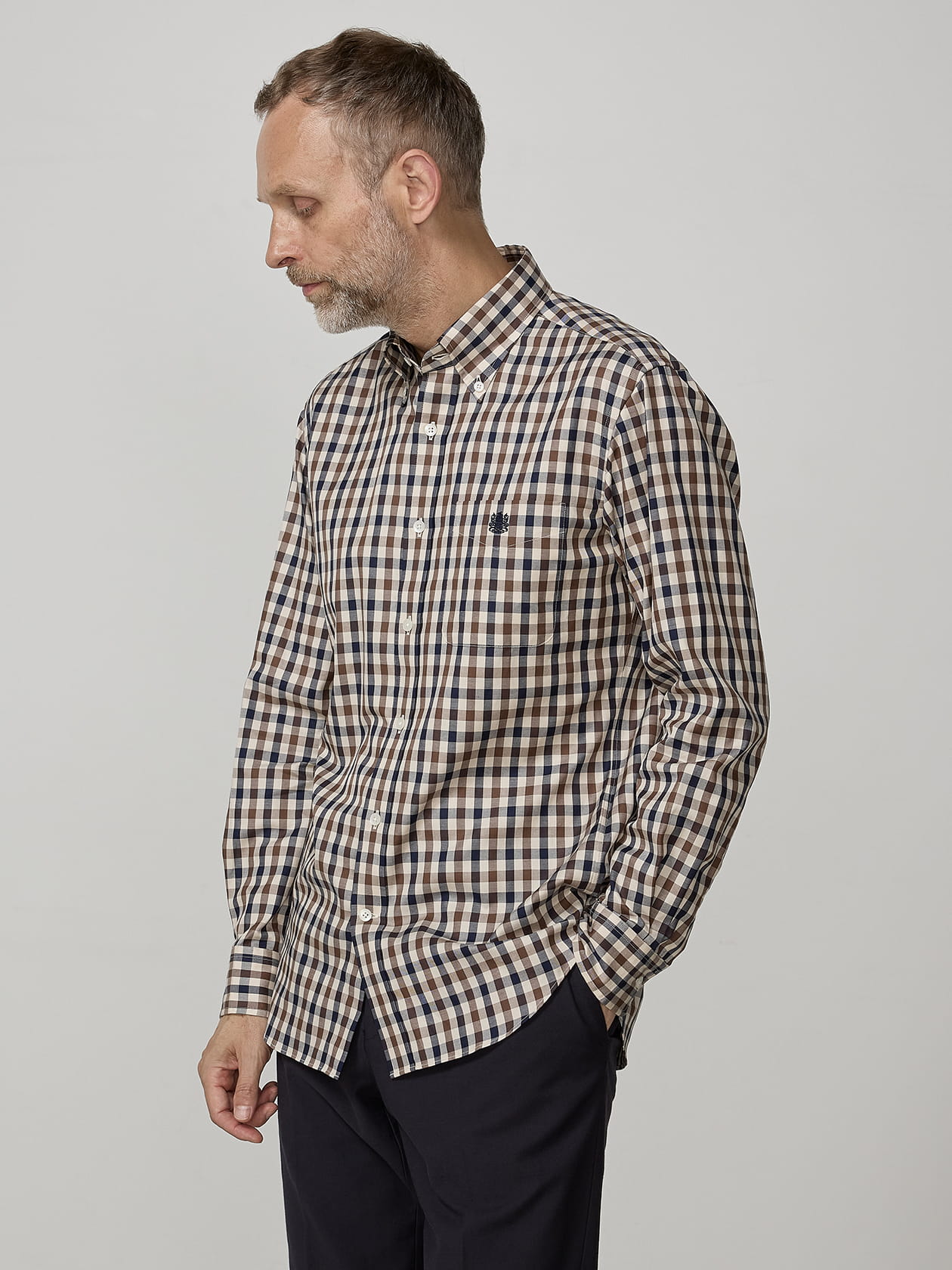 Aquascutumのアイコンである、クラブチェックシャツ柄のカジュアルシャツ。