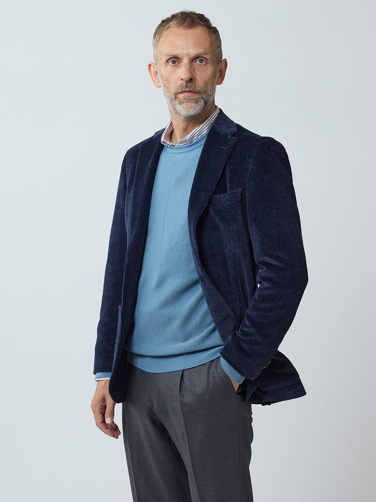 上品な光沢と伸縮性に富んだ、深いブルーが好印象なジャージー素材のベロアジャケット イタリア・マッジア社のジャージー素材は上品な光沢が魅力のファブリック。一般に、布帛(織生地)に比べてカジュアルな印象が伴う編み生地のジャケットですが、光沢あるベロア生地で仕立てる事で、祝賀会やちょっとしたパーティ、敷居の高めなレストランでも通用するラグジュアリーさを表現。 生地表面の細かな千鳥柄が、無地とは一味違った洒落感を演出してくれています。 白・黒のタートルネックや定番色の長袖ポロシャツ、或いはブルー系統のニットを添えたグラデーションコーデなど、ジャケットの光沢を主役に据えたスタイルを楽しみたい一着です。 ・画像はサンプルのため、実際の商品と若干異なる場合があります ・照明の関係により、実際よりも色味が違って見える場合があります またご利用の環境により、若干製品と画像のカラーが異なる場合もございます ・商品の色味は、商品アップ画像をご参照ください