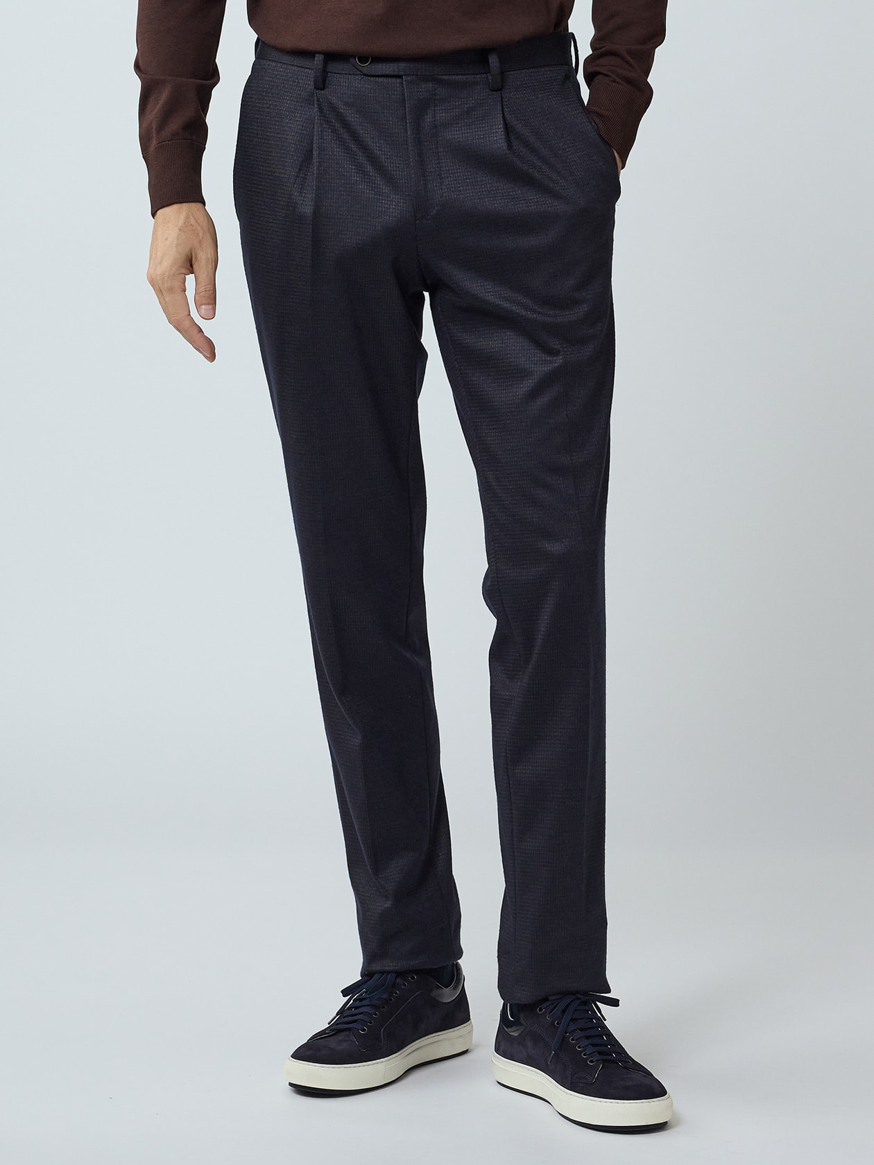 チェスナットブラウン×ダークネイビのシックな配色の、ビジネスシーン想定の千鳥柄ジャージーセットアップ。こちらはトラウザーズの紹介ページです。 伸縮性を謳うセットアップが市場に溢れて久しい昨今、その中でもウールの質感と上品な色表現にこだわった一着となります。 混紡のポリエステル糸にはバネ構造を持ったソロテックス糸を採用し、上質なウールの質感・ポリエステル糸の保形性・ソロテックス糸の伸びやかさを併せ持つ、ワンランク上のセットアップに仕上がりました。 スウェットのような温かさと保温性を感じつつも、ひざが出てきたりヒップがたわんだりといったシルエットの崩れにも強い一着。トラウザーズのシルエットはコーディネート全体の印象を大きく左右するので、出番の多いウォッシャブルアイテムのパンツこそ、保形性にはこだわりたいところです。