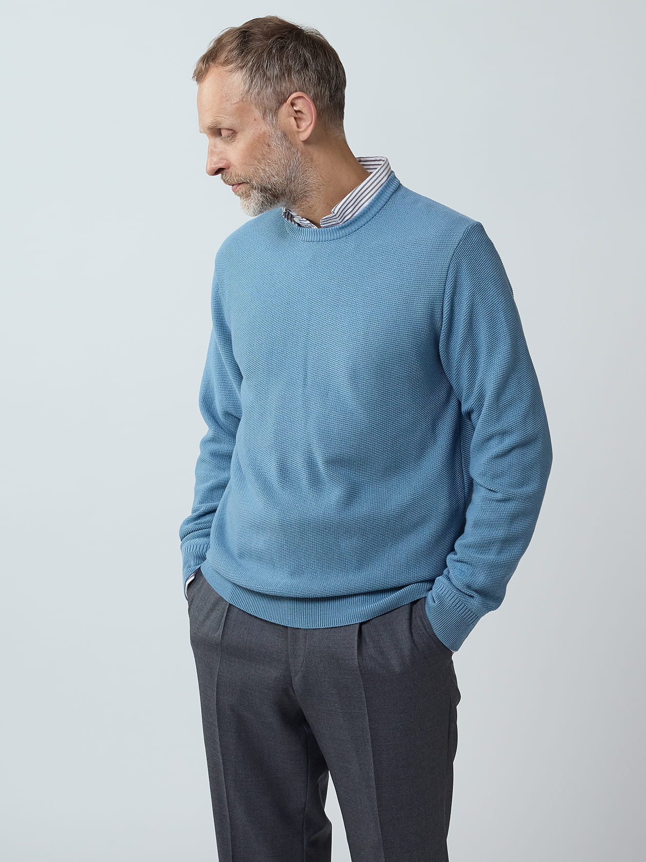 ビエラヤーン19.5マイクロンのウールに25%のシルクをブレンドした、梳毛で編み上げたニットアイテムです。 一般的にニットは空気を含んだ短く太い繊維を撚った紡毛糸にて作られますが、こちらはよりツルっとした肌触りが特徴の梳毛糸で編み上げて作製。素材由来の肌当たりの滑らかさが最大の特徴で、ニットのチクチクが苦手な方にこそお勧めしたい一品です。 ロンドンの青空をイメージしたロンドンスカイブルーと、19世紀初頭のしっくい壁にインスピレーションを受けたスタッコベージュの2色で展開。