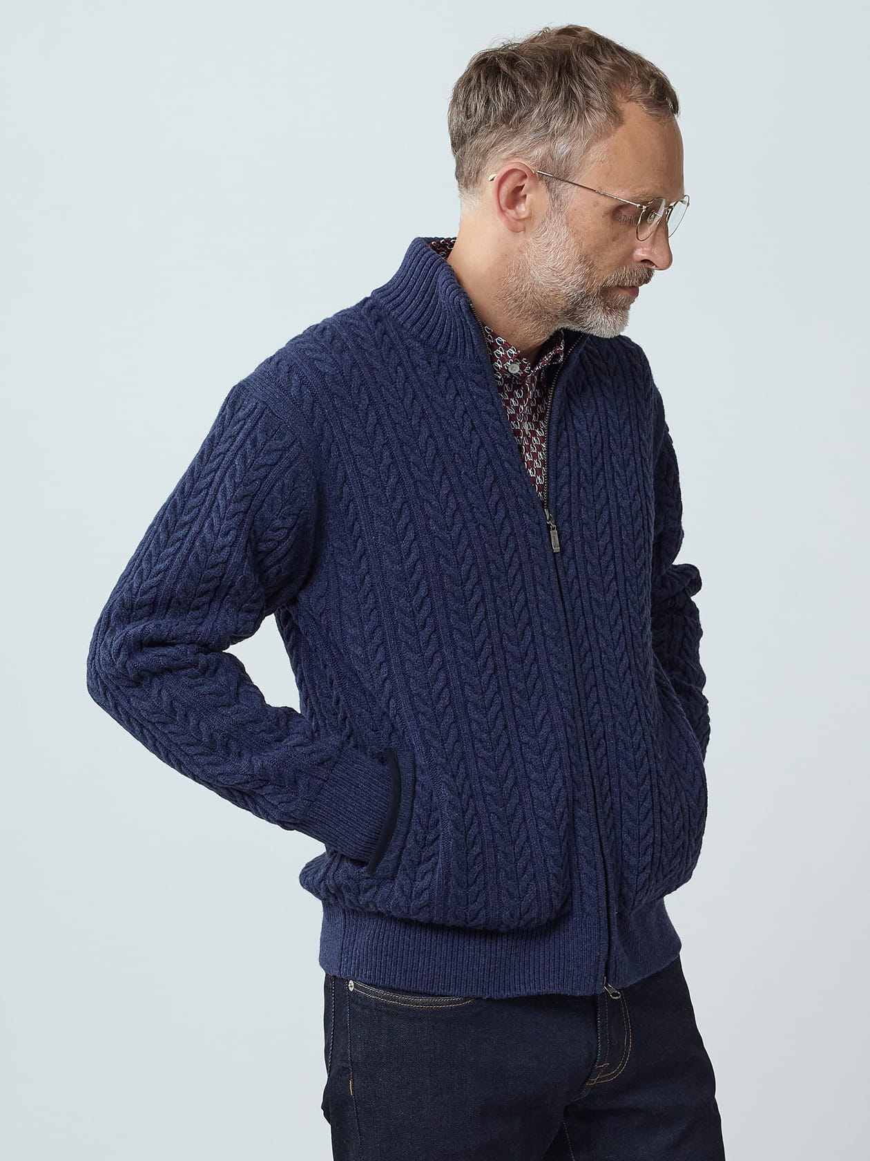 表面のネイビーの色糸とは別に、裏糸にはパープルの色糸を採用。それを凹凸の凹み部分に裏糸が現れやすいケーブル編みで編みたてる事で、ネイビーとパープルとが複雑に絡み合った奥行ある色表現を可能とした一着です。