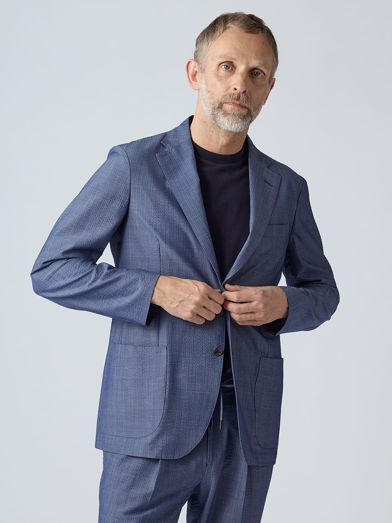 ご家庭洗濯可能な手軽さや、快適な着心地などの魅力で人気の「TEC.3」シリーズから、アクアスキュータムが提案するハイエンドなシアサッカーセットアップをご紹介です。 他ブランドとの差別化を図ったシアサッカー生地はなんとウール配合。化繊だけではなかなか表現できない上品な光沢とドレープ感が魅力の1着です。通常、サッカー生地にウールを配合すると重量が増してしまいがちですが、上質な繊維から紡いだウール糸を使用する事で、盛夏アイテムらしい軽量さを実現しました。 また、最軽量仕様のジャケットでありながら左胸内側にファスナー式の内ポケットを搭載。夏のウォッシャブルアイテムで内ポケットが付くのは意外と珍しく、お探しの方も多かったのではないでしょうか。 使い勝手のいい万能なブラックと、26年春夏のシーズンテーマから、ハーブティーとして名高いイギリスの夏の花「ブルーマロウ」を彷彿とさせるやや紫がかった水色の2色でリリース。セットアップ展開の同色同生地パンツと合わせて、上品な夏スタイルを楽しめます。