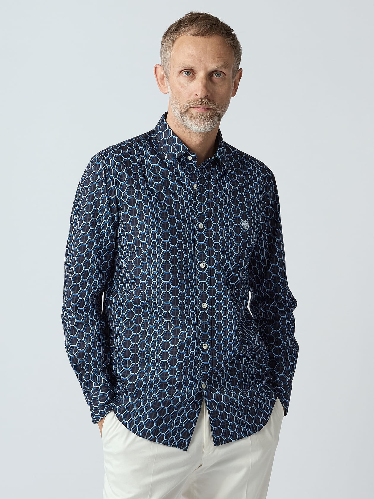 26年春夏のシーズンテーマ「キューガーデン」の敷地内には印象的なインスタレーションも数多く点在しています。代表的なものの一つが「The HIVE」と呼ばれる、ハチの巣をモチーフとした巨大な構造物。植物の受粉において大切な役割を担っているミツバチの生態を体験できる施設で、キューガーデンの目玉インスタレーションの一つとなっています。 そんなアート作品からインスピレーションを受けたハニカム柄のシャツを2色ご用意いたしました。 タテヨコに50/1を用いた目面のきれいなブロード生地に、インクジェット手法でハニカム柄を大胆にプリント表現。鉄紺の上に思い切った配色でラインを引いた、1枚着として活躍しそうな1着と、ブランド伝統のクラブチェックカラーを採用したコーディネートに取り入れやすい1着でご提案です。
