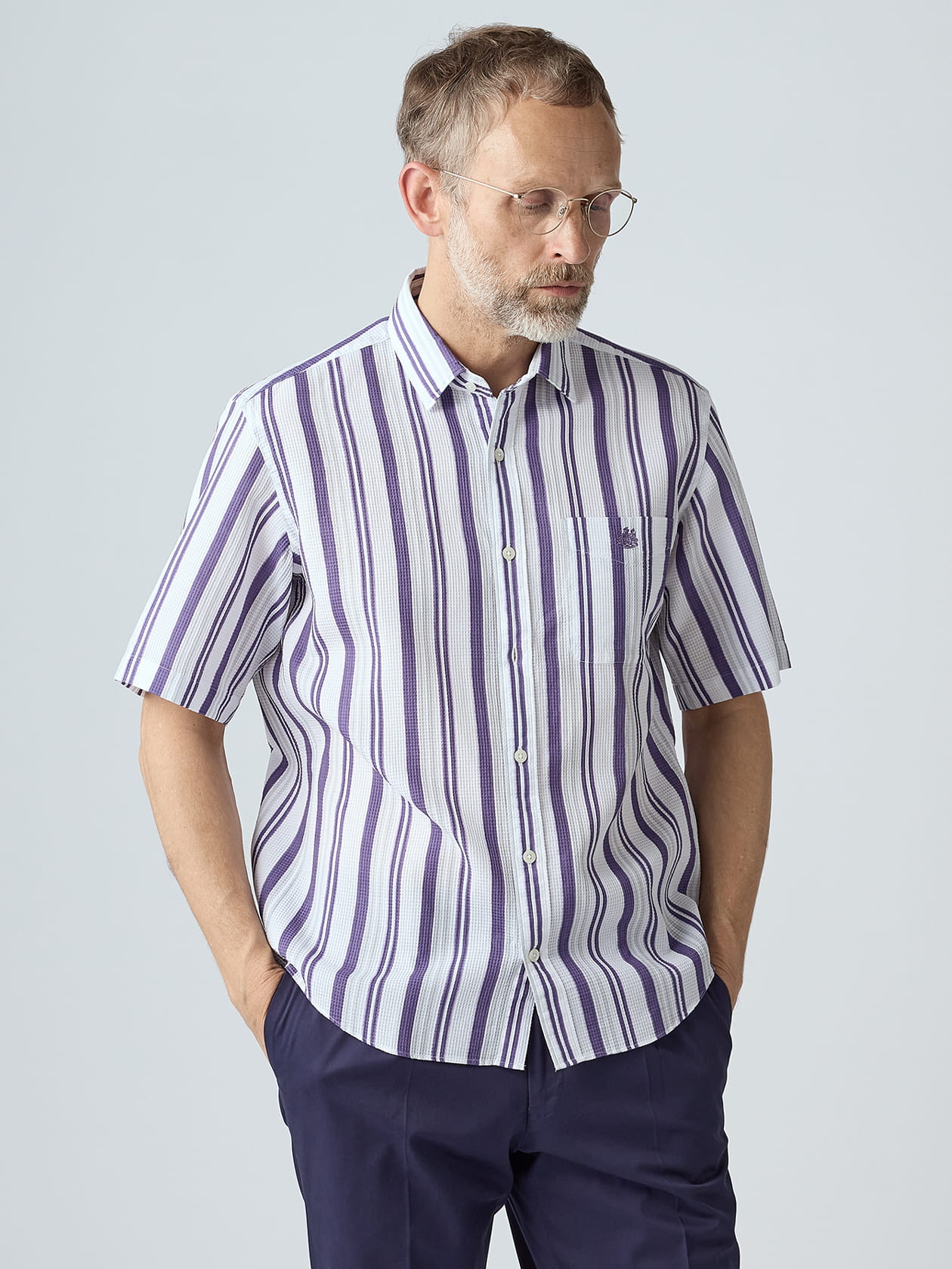 夏時期には凹凸のある生地を用いたシャツがオススメです。肌との接地が面ではなく点となる事で汗によるハリ付きを軽減したり、空気の通り道を確保して風が抜けていくのを手伝ってくれたりと、軽やかな着心地を体感できます。 コットン100%のワッフル組織を用いたこちらのシャツもその一つ。天然素材由来の滑らかな肌触りも手伝って、ワンランク上の着心地を提供する半袖シャツに仕上がりました。 凹凸のある生地にプリント柄を施すのは技術的負荷の高い作業となりますが、欧州の老舗テキスタイルメーカー「テクスティーナ社」はプリント技術に定評があり、リズム感のあるマルチストライプを見事に表現。シーズンテーマの「キューガーデン」に咲くイングリッシュ・ラベンダーの配色を落とし込んだ1着は、見た目にも爽やかな今季イチオシのアイテムです。