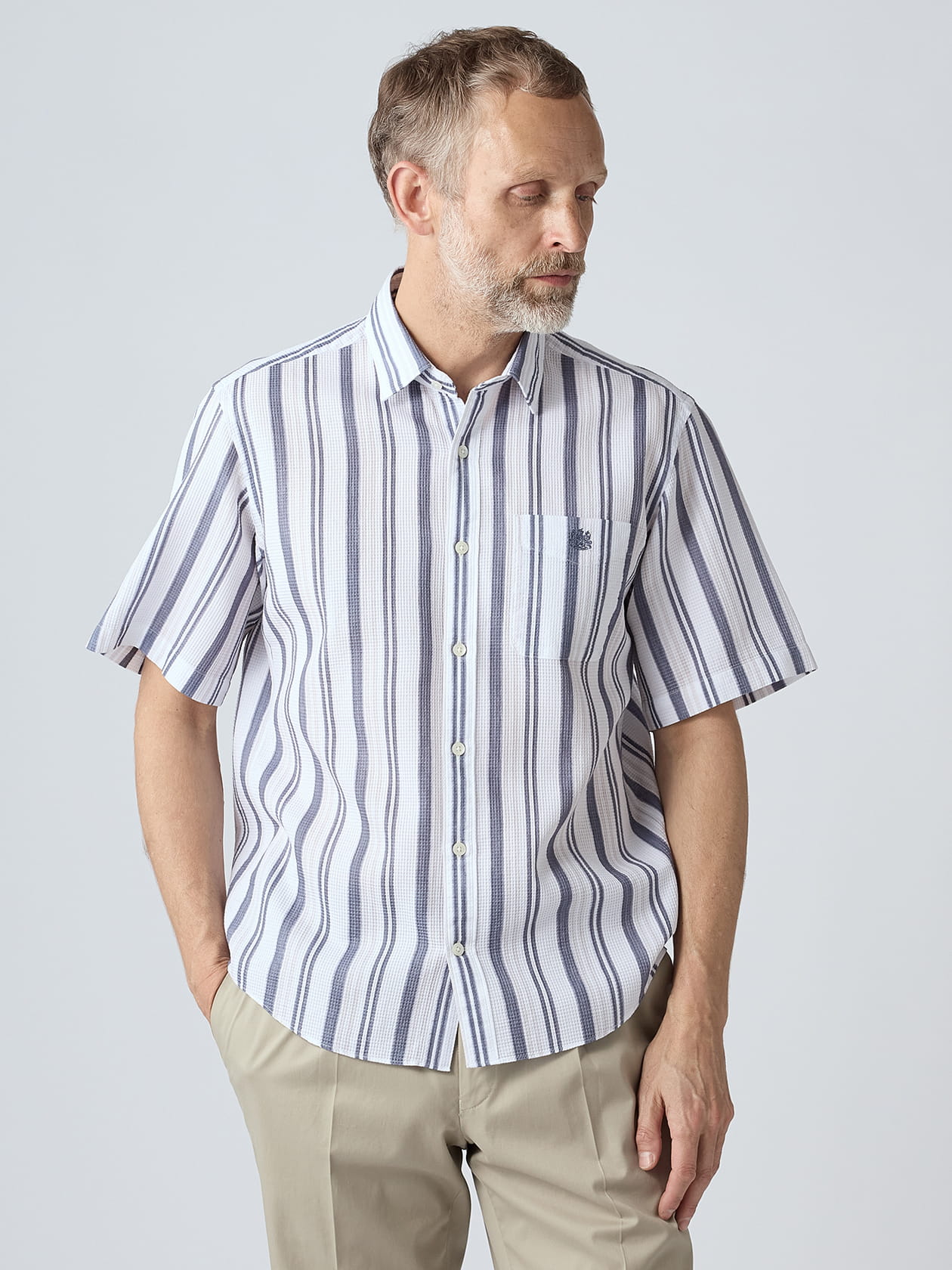 夏時期には凹凸のある生地を用いたシャツがオススメです。肌との接地が面ではなく点となる事で汗によるハリ付きを軽減したり、空気の通り道を確保して風が抜けていくのを手伝ってくれたりと、軽やかな着心地を体感できます。 コットン100%のワッフル組織を用いたこちらのシャツもその一つ。天然素材由来の滑らかな肌触りも手伝って、ワンランク上の着心地を提供する半袖シャツに仕上がりました。 凹凸のある生地にプリント柄を施すのは技術的負荷の高い作業となりますが、欧州の老舗テキスタイルメーカー「テクスティーナ社」はプリント技術に定評があり、リズム感のあるマルチストライプを見事に表現。シーズンテーマの「キューガーデン」に咲くイングリッシュ・ラベンダーの配色を落とし込んだ1着は、見た目にも爽やかな今季イチオシのアイテムです。
