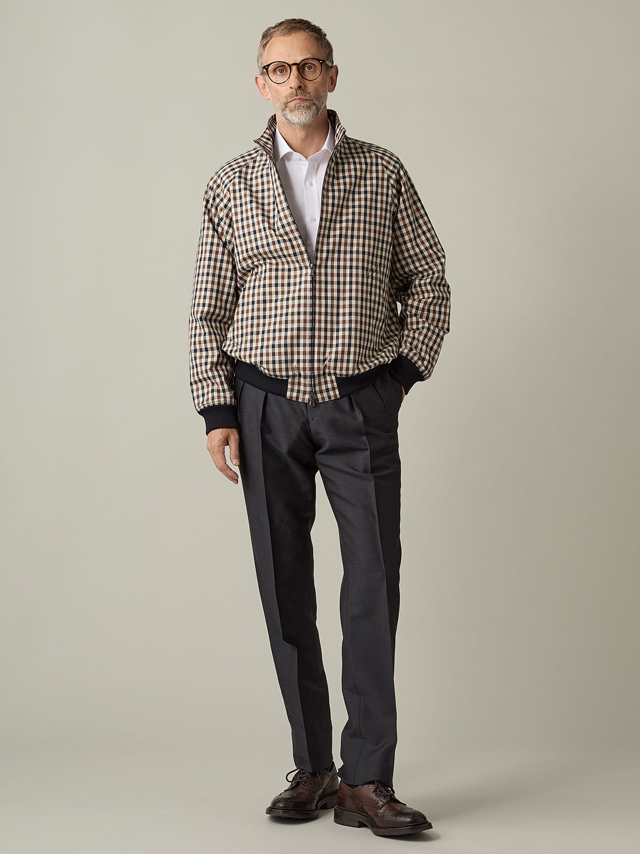 素材には「Filey Long」と共通のコットンクラブチェック生地を使用。繊維長の長い高品質な80/2の綿糸をタテヨコに打ち込んだ高級感あふれる素材です。アイデンティティを盛り込んだ英国的な表情とゆとりあるボディが魅力。ウールトラウザーズ、シャツとのコーディネートで伝統的なクラススポーツスタイルを構築できる1枚です。