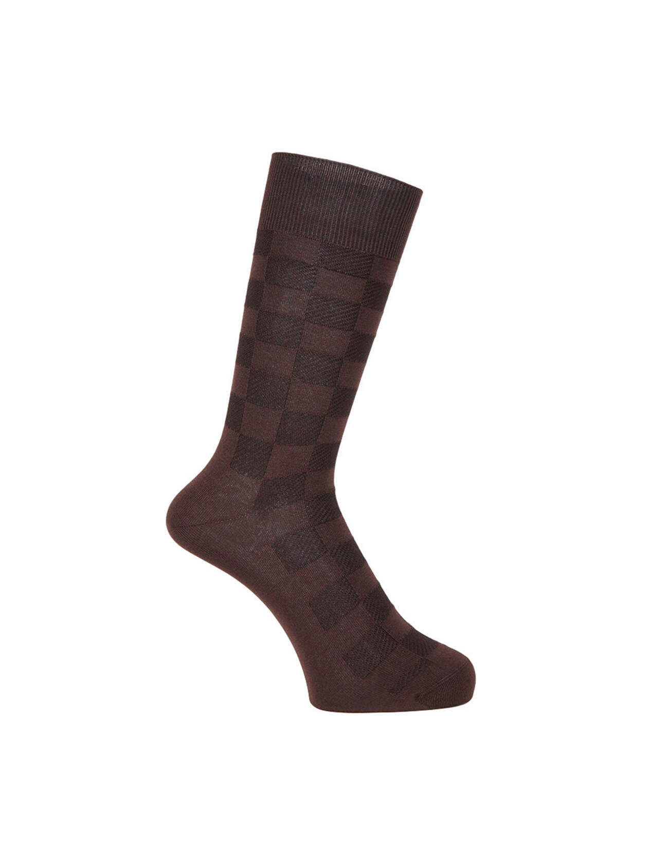 リンクス(地柄)編みのブロック柄。さりげない陰影でぐっとおしゃれな「シャドーブロック」のビジネスソックス。ガスシルケット糸を使用しており、綺麗な光沢感が特徴です。MADE IN JAPAN。
