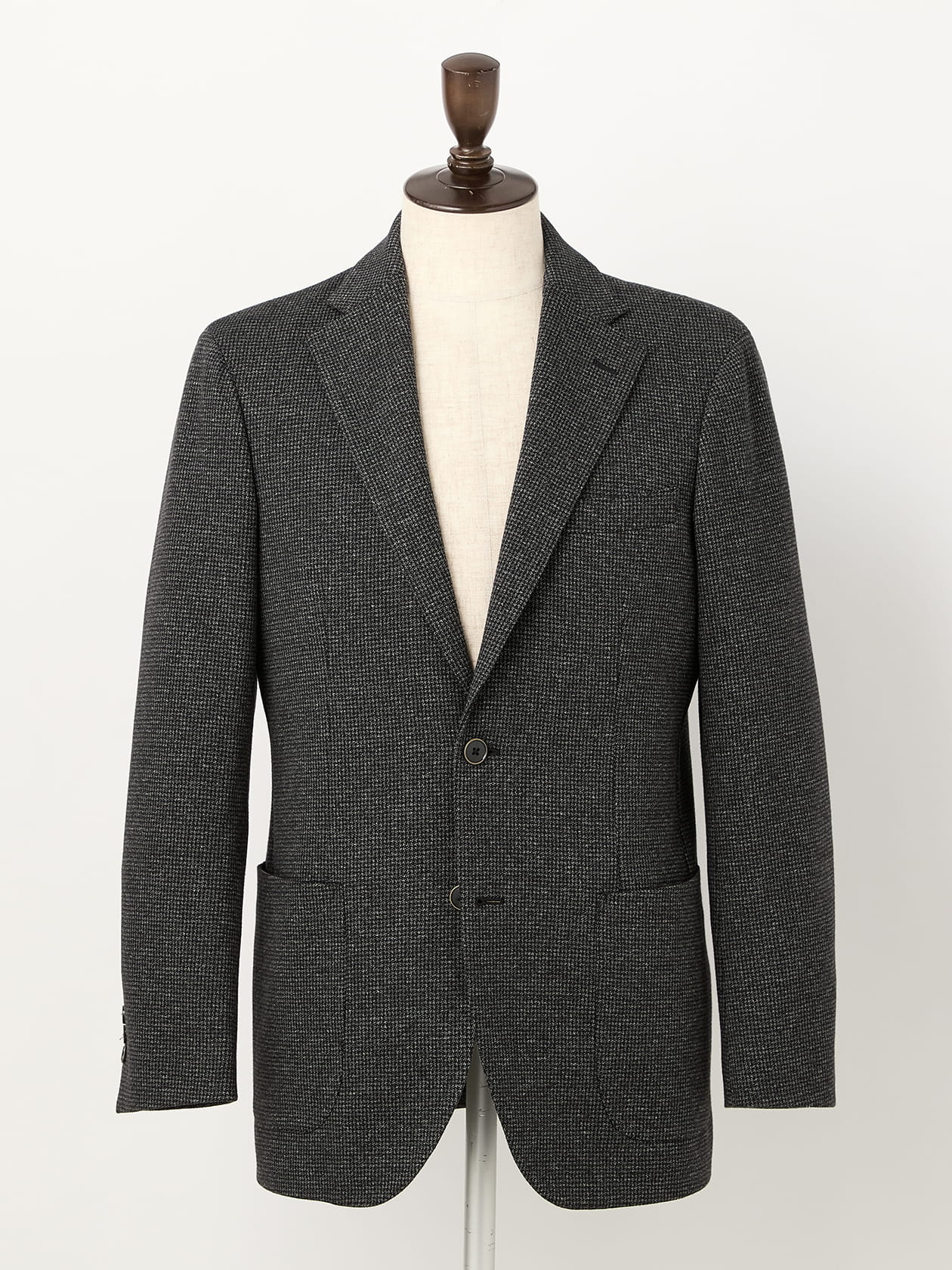 編みで柄と柔らかな表情が表現された千鳥ジャケット。 原色原料を精紡交撚して作り上げた杢糸を使用することで、色柄に品のある奥行きをもたせています。