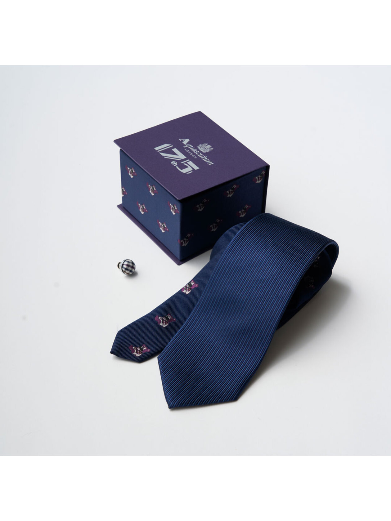 小剣には、ポップアーティスト・ハタヤママサオ氏が描き下ろした「175周年限定ベア」を配置。一見すると端正なソリッドタイでありながら、結び目からさりげなく覗くベアが大人の遊び心と祝祭感を上品に演出します。ブランドの象徴であるクラブチェックとパープルをまとったベアが、175年の歴史に現代的なアクセントを添えた一本です。