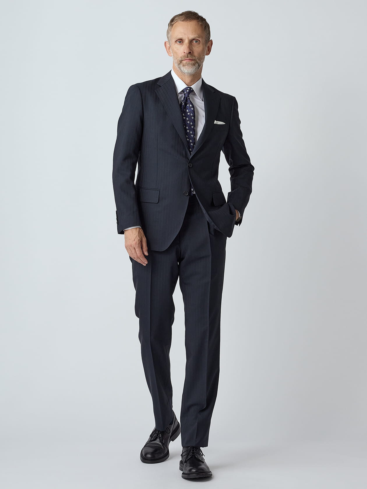 ネイビーの中でもやや黒っぽい鉄紺の表情と、シャドーで施されたストライプとが清廉な雰囲気を醸し、夏場のスーツであっても決して軽薄にならない英国然とした見栄えにこだわった1着です。