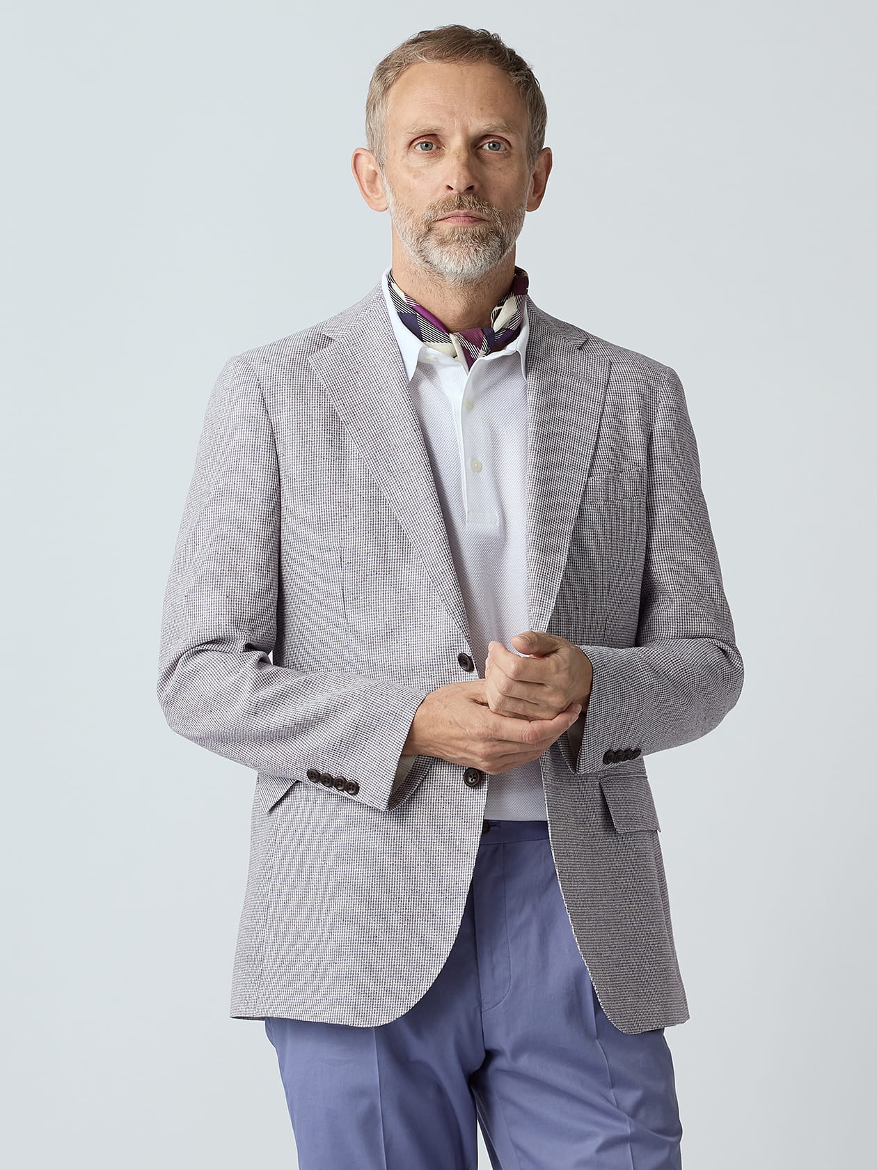 夏場のジャケットシーンに最適なリネンリング糸を用いた清涼ジャケットです。 リング糸とは装飾糸の1種で、芯となる細い糸に太い糸を絡ませた糸の事。これを節のあるリネンで行うことで、糸自体の凹凸を生かしたシャリ感と、肌離れの良さが魅力の生地となります。 そんな軽やかな生地で仕立てたジャケットを、今季シーズンテーマの「キューガーデン」から、5~6月が見頃となるアリウムの花のカラーリングを用いて表現。 ガーデンの象徴的な温室「パームハウス」の周りに咲くアリウムは、紫、赤、青、白と、品種に様々な花をつける事でも有名な植物で、その色調をミックスするようにリネン糸を染色し、淡い色同士が混ざり合う事で表現される絶妙な色彩が、夏場の羽織物として視覚的な清涼感を演出する一着に仕上がりました。