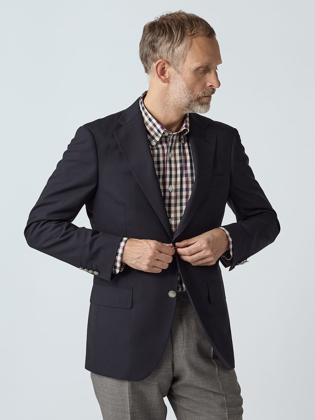 国内尾州産のスーパー140's原料を使った、英国らしい鉄紺が魅力のブレザーです。 日本で「紺」というと青みがかった色を想像しますが、英国の紺はいわゆる「鉄紺」と呼ばれる、かなり深い色合いを表現します。19世紀初頭のガス灯の光の下では黒は赤茶色のように見えてしまうため、黒の代わりとして鉄紺を着用するようになったとする説が有力なようです。 鉄紺のブレザースーツはブラックフォーマルに次いで格式高い衣服と位置付けられており、式典やパーティにも着て行けるシーンレスな一着。そんな英国の伝統を汲んだ色調の紺ブレを、現代版に再解釈したこちらの一枚は、副資材や肩パッドなどをナチュラルなものへ変更し、よりコンフォートに仕上げました。 英国らしい構築的なシルエットは維持しつつ、着心地軽やかに生まれ変わったブレザーが登場です。