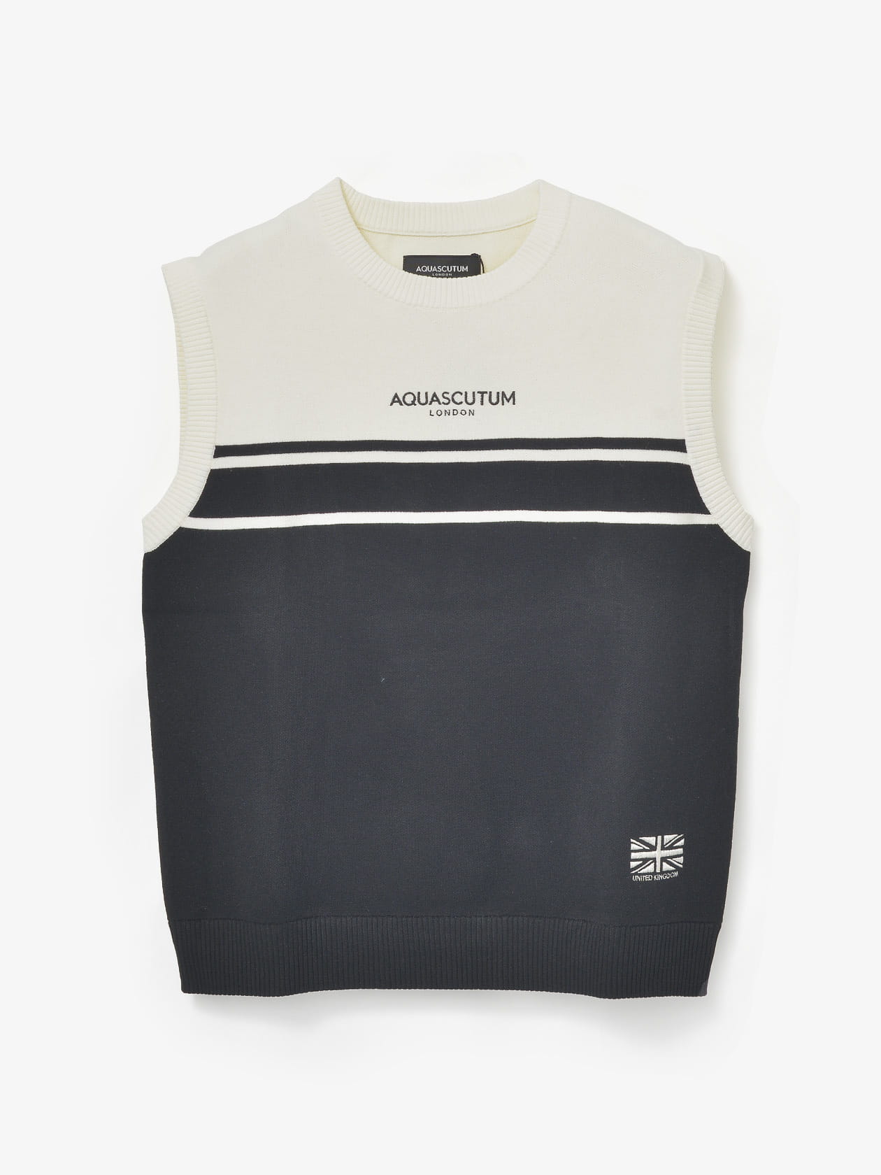 素材は軽量なポリエステル糸と吸水性と通気性に優れたレーヨン糸を合わせた糸を使用。自然な温度調整機能があり、弾力性もあるため着心地の良いクルーネックニットベストです。