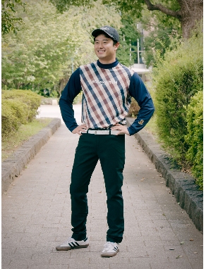 見頃はクラブチェック、袖は無地のバイカラーモックネック。
