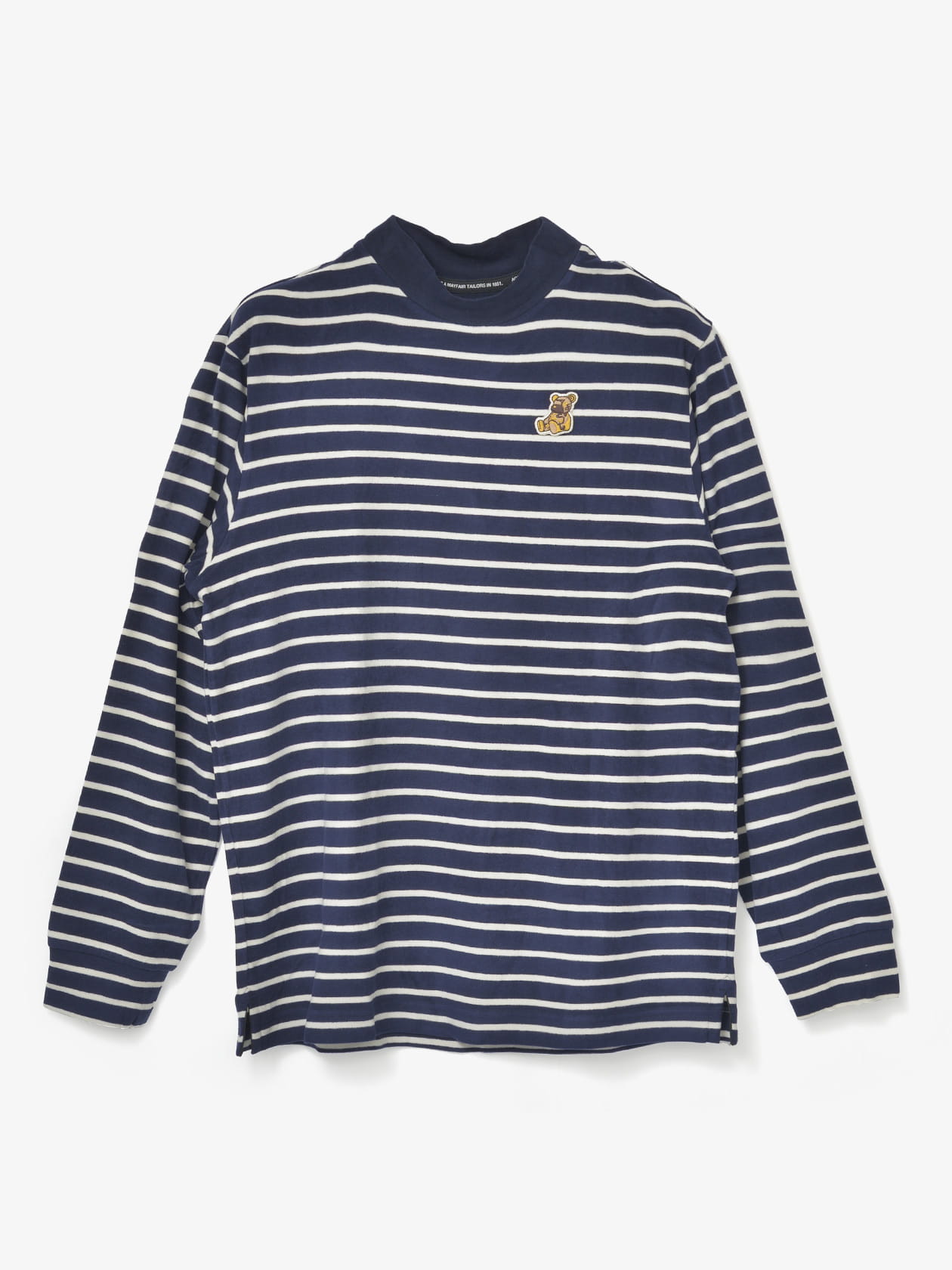 胸にAQベアワッペンを付けたボーダー柄モックネック。